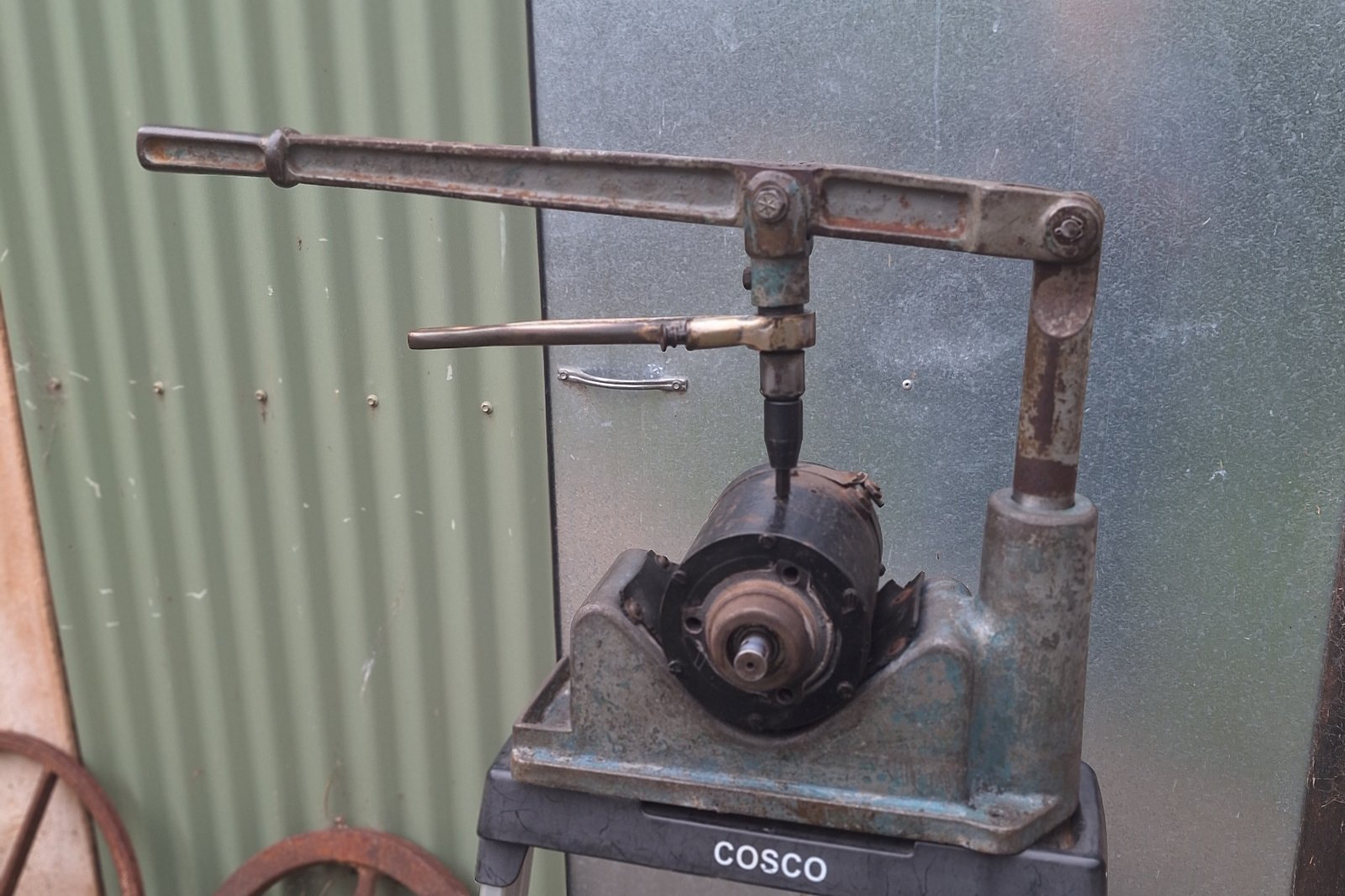 George, It isn't brazed. It is a bronze casting, a bit rough in places. It is a 1/2" ratcheting handle, complete with the brand of the appliance stamped into the handle. With weight on the long handle, the ratchet handle turns the screwdriver bit, either in or out. From some hammer marks on top of the long handle, it looks like some screws needed a little encouragement to break loose.