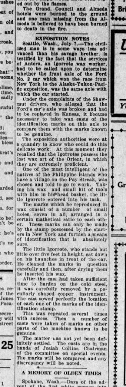 The Igorot people have millennia-old expertise with the metal-forging process known as "lost-wax casting." Coincidentally, all of the cars in the race bore a series of wax seals showing the insignia of the Automobile Club of America, which had been applied right before the start to those major components (axles, engines, etc.) that were not allowed to be replaced during the race, only repaired.