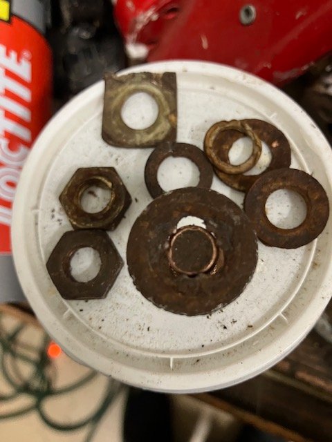 I have the shorted stud off of the switch. After taking the nuts off I tried to turn what I think is a threaded washer off but that didn't seem to work so I put a nut on the end and hammered it and it came off with problems. I think that this washer is threaded to the stud and I bent it out of shape a bit by hammering it off. In picture one the metal washer circled in red in picture 3. You can see the gouging in picture one. I turned it the last few turns off the end of the stud and that was worse shredding the threads. When I got it off I found it has a triangular hole in the washer so I think it was kind of threaded. I hesitate to put this back on because I think it will tear it up again. I had to get my tap and die set and re-cut the 3/8 inch 16 pitch threads. Whatever the original grey insulating material is on the inside it is sheared off and probably no good anymore. It is pictured in picture 3 the topmost grey square material. From picture one that stack was from top down a threaded washer and two insulating washers. The stud had two nuts and a split washer to hold the cable on. I also managed to lose somewhere Lang's starter switch non-conducting gasket/washer set 5014GS that arrived in the mail. I don't know how to proceed from here to re-pack that stud back on. I think that threaded washer is damaged and I don't think the stud would take another tearing up again. I also don't have any non-conducting 3/8 washers since I lost the 5014GS packet. I would need 3 non-conducting 3/8 inch fibre washers and a way to hold it down. Maybe a 3/8 16 pitch jam nut? Amazon has 3/8 non-conducting fibre washer but they want to sell me 30 of them, same with the jam nut they want to sell me 25 of them. Maybe it will work to hammer the threaded washer flat again and try my chances.