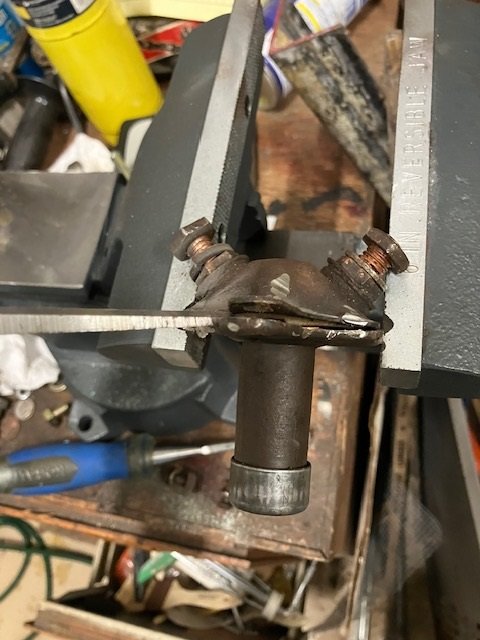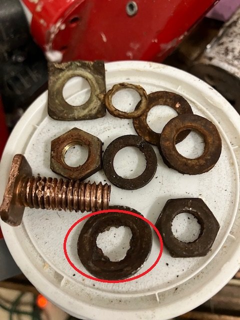 I have the shorted stud off of the switch. After taking the nuts off I tried to turn what I think is a threaded washer off but that didn't seem to work so I put a nut on the end and hammered it and it came off with problems. I think that this washer is threaded to the stud and I bent it out of shape a bit by hammering it off. In picture one the metal washer circled in red in picture 3. You can see the gouging in picture one. I turned it the last few turns off the end of the stud and that was worse shredding the threads. When I got it off I found it has a triangular hole in the washer so I think it was kind of threaded. I hesitate to put this back on because I think it will tear it up again. I had to get my tap and die set and re-cut the 3/8 inch 16 pitch threads. Whatever the original grey insulating material is on the inside it is sheared off and probably no good anymore. It is pictured in picture 3 the topmost grey square material. From picture one that stack was from top down a threaded washer and two insulating washers. The stud had two nuts and a split washer to hold the cable on. I also managed to lose somewhere Lang's starter switch non-conducting gasket/washer set 5014GS that arrived in the mail. I don't know how to proceed from here to re-pack that stud back on. I think that threaded washer is damaged and I don't think the stud would take another tearing up again. I also don't have any non-conducting 3/8 washers since I lost the 5014GS packet. I would need 3 non-conducting 3/8 inch fibre washers and a way to hold it down. Maybe a 3/8 16 pitch jam nut? Amazon has 3/8 non-conducting fibre washer but they want to sell me 30 of them, same with the jam nut they want to sell me 25 of them. Maybe it will work to hammer the threaded washer flat again and try my chances.