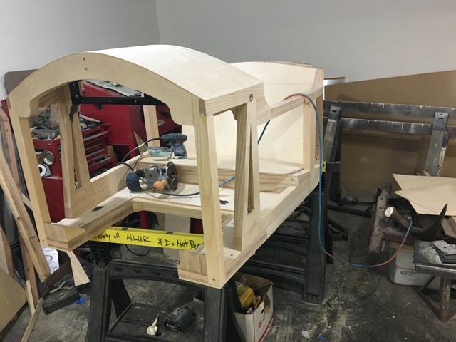 I have the body frame done but it’s not skinned yet. It is going to use wider strips (3-4 inches wide). I had to work out some mechanical things before finishing the body, but I am getting back to it. Here are a couple of shots of the body frame.
