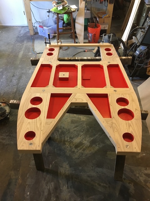 I have the body frame done but it’s not skinned yet. It is going to use wider strips (3-4 inches wide). I had to work out some mechanical things before finishing the body, but I am getting back to it. Here are a couple of shots of the body frame.