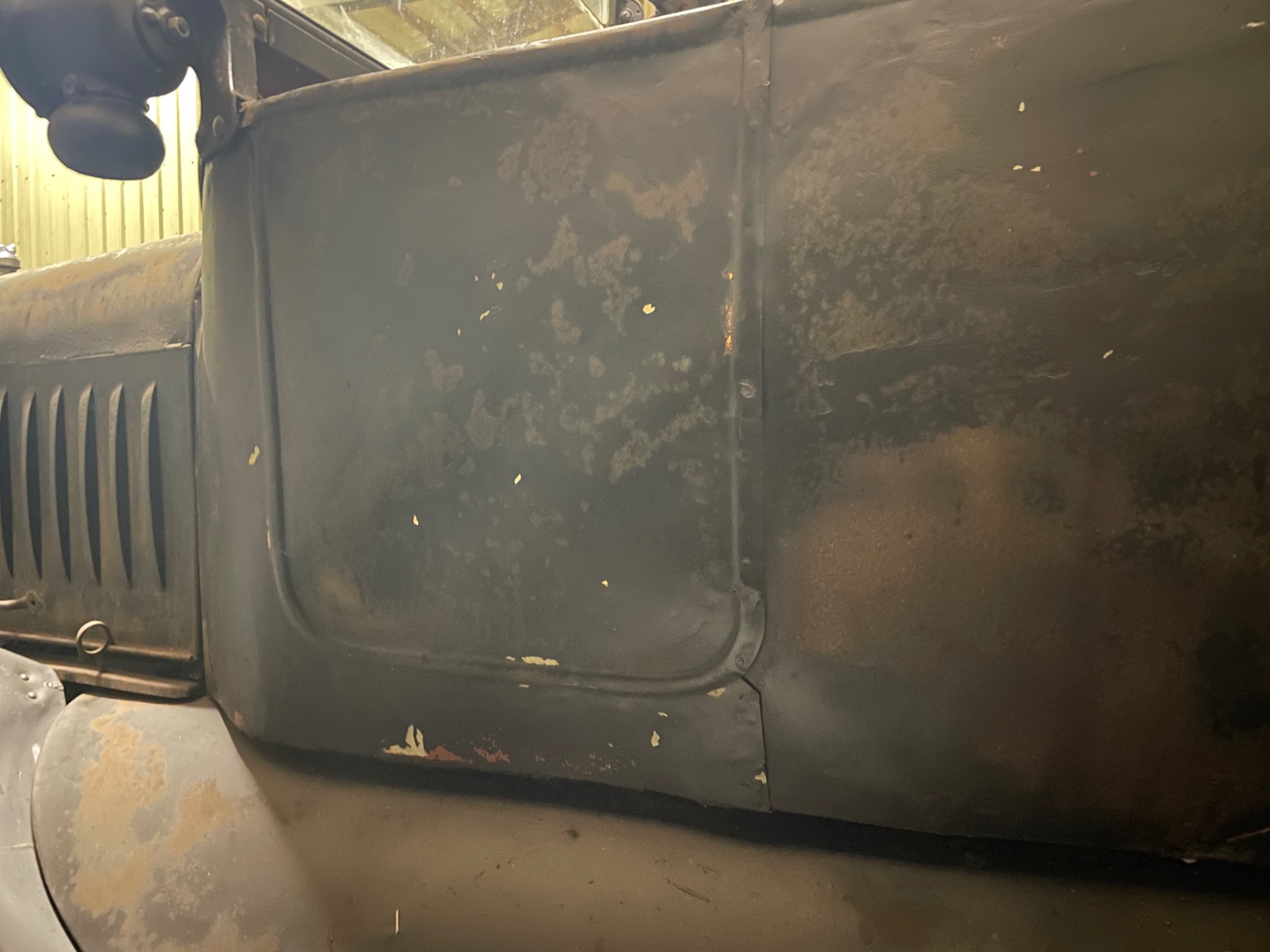 JR. I’m pretty sure that the seam is left visible. The one on the passenger side (door) looks like it was leaded over or maybe bondo. Originally those seams were spot welded. The seam fit flat. The remains I’ve seen of partial bodies those seams were spot welded. Some have been riveted with small steel rivets and hammered pretty flat so it’s not real noticeable over the years for a repair. To do that you can use a bucking bar on the inside and use a small flat hammer on the outside.