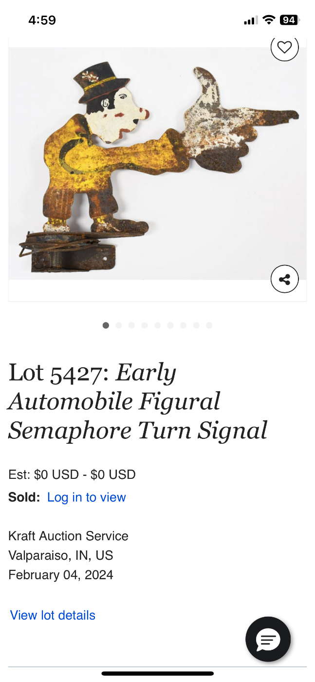 Hi all- I’m looking for information on this turn signal. It’s cable operated and seems like it would mount on the right rear fender. When the cable is pulled, it swings from facing forward to pointing right. It’s about 10” tall. Is it original or reproduction? Who made it? Thanks!