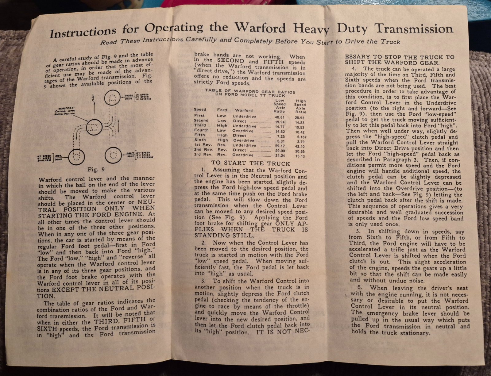 I take off with Ford low and Warford low, let the Ford gear into top next and then Warford 2nd gear, [Standard Ford high ratio] I can only use the Warford overdrive in favourable conditions out on the open road. I love the thing!
