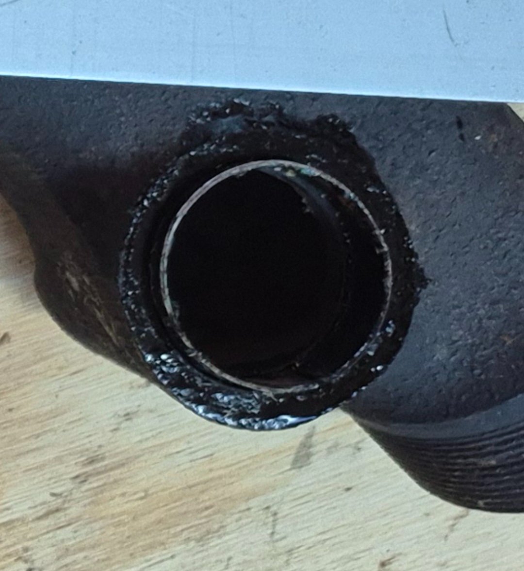 Initial goal being to check valve clearance, I (quite literally) yanked the manifolds...which were stuck. Ended up being the typical warped exh manifold, which was 1/16" off plane on #3 and 1/4" off on #4. The prior assembly was done by placing the sleeve rings in the manifold and torqued down to cut into a thick gasket, but, that wasn't good enough so they were slathered in form-a-gasket which became a sticky tar glue!!! Interesting too a noted scratched "X" in the head above the offending port. New manifold on the way, tar removal in progress.