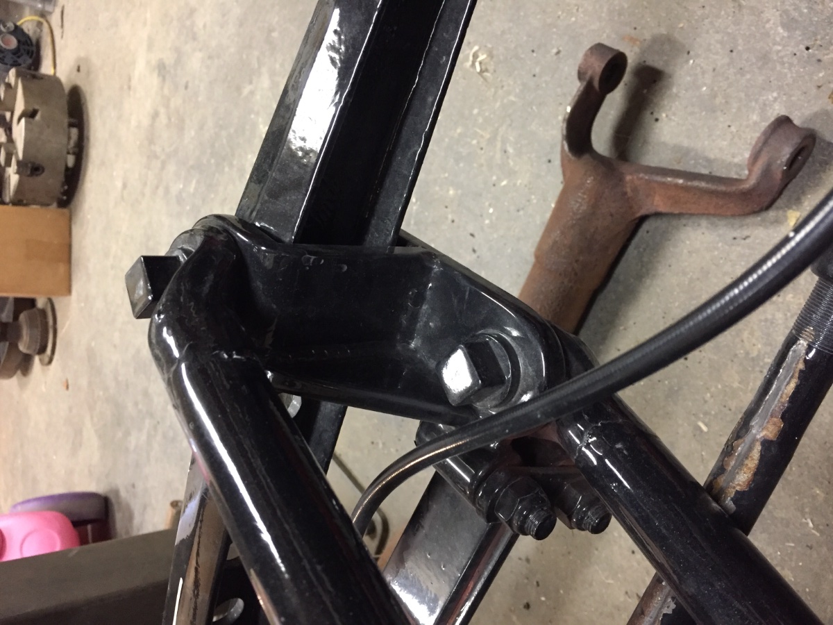 I also have discovered to my dismay, I will not be able to use the lowering brackets I made for the front axle. When I first assembled all that stuff, I did not have the engine in it, just by chance I looked down at the tie rod and wishbone and NOPE aint gonna work WAY to close. I have looked at 2 books on speedsters and can't see any solution to the issue but to find a good pair of 26-7 spring perches and just be happy with the reverse eye springs front and rear giving me a inch of lowering.