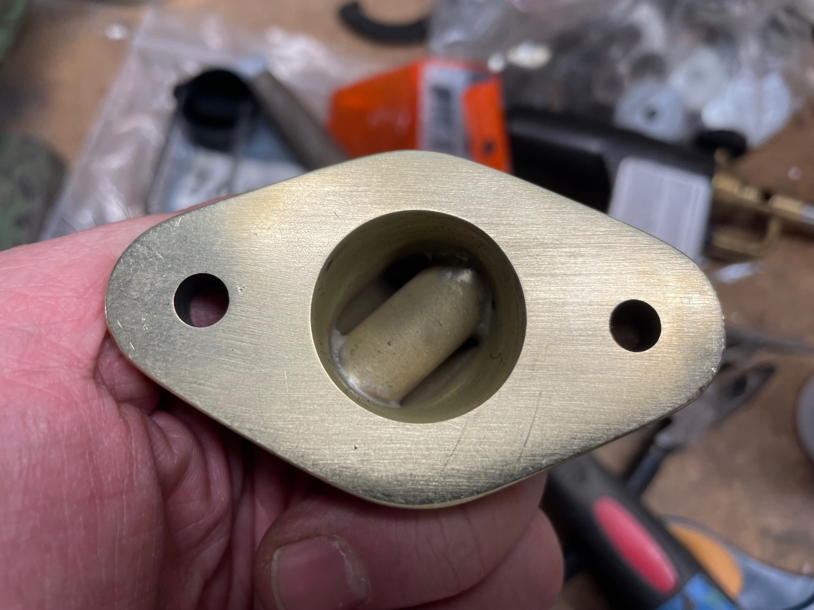 I got a really nice original Boyce Motometer water temp gauge to go in the dash on my speedster project. The sensor on these is different than modern water temp sensors in that they are not water tight. They had a special sensor mount that they went in. I wanted to make a mount to attach it to the intake manifold heater port on my Rajo BB. I couldn’t just stick it straight in the hole as there is a head-bolt that would interfere, and the capillary tube would be in the way of the manifold. I came up with a design that brought the tube back towards the firewall at a 45 degree angle. Water from the head comes into the mount and surrounds the brass tube the sensor goes into. It needs some more polishing and I might nickel plate it, but it’s looking pretty good. I always like to make things look like they could be something from the period.