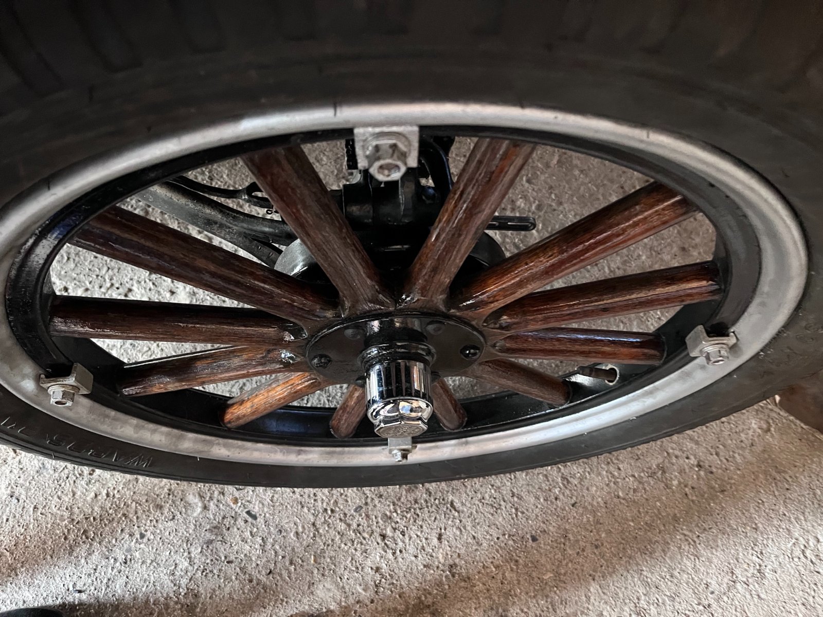 This spare tire is installed on a demountable rim without fixed lugs, so it has loose lugs to install them to the felloe (I think they are called Kelsey lugs).