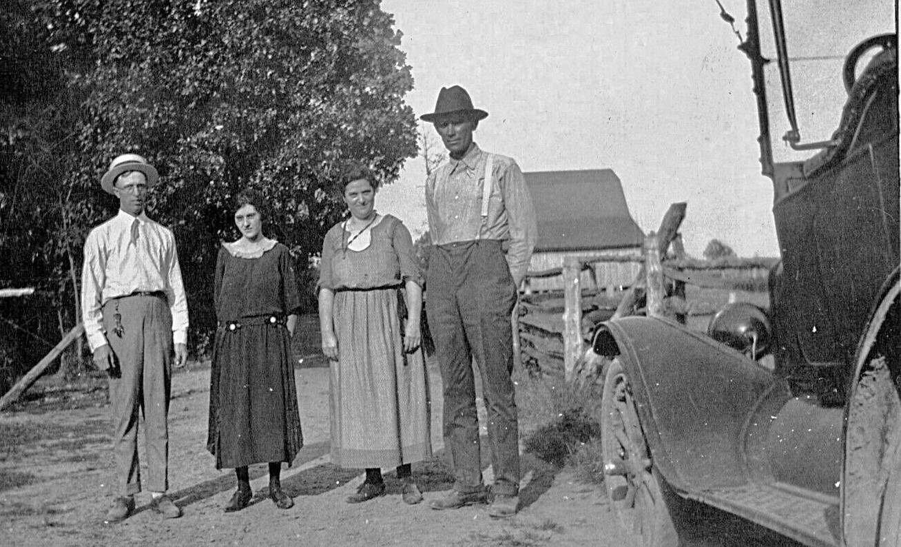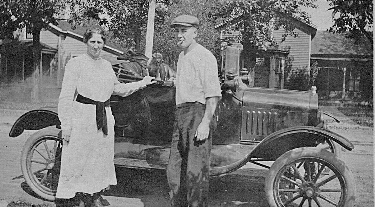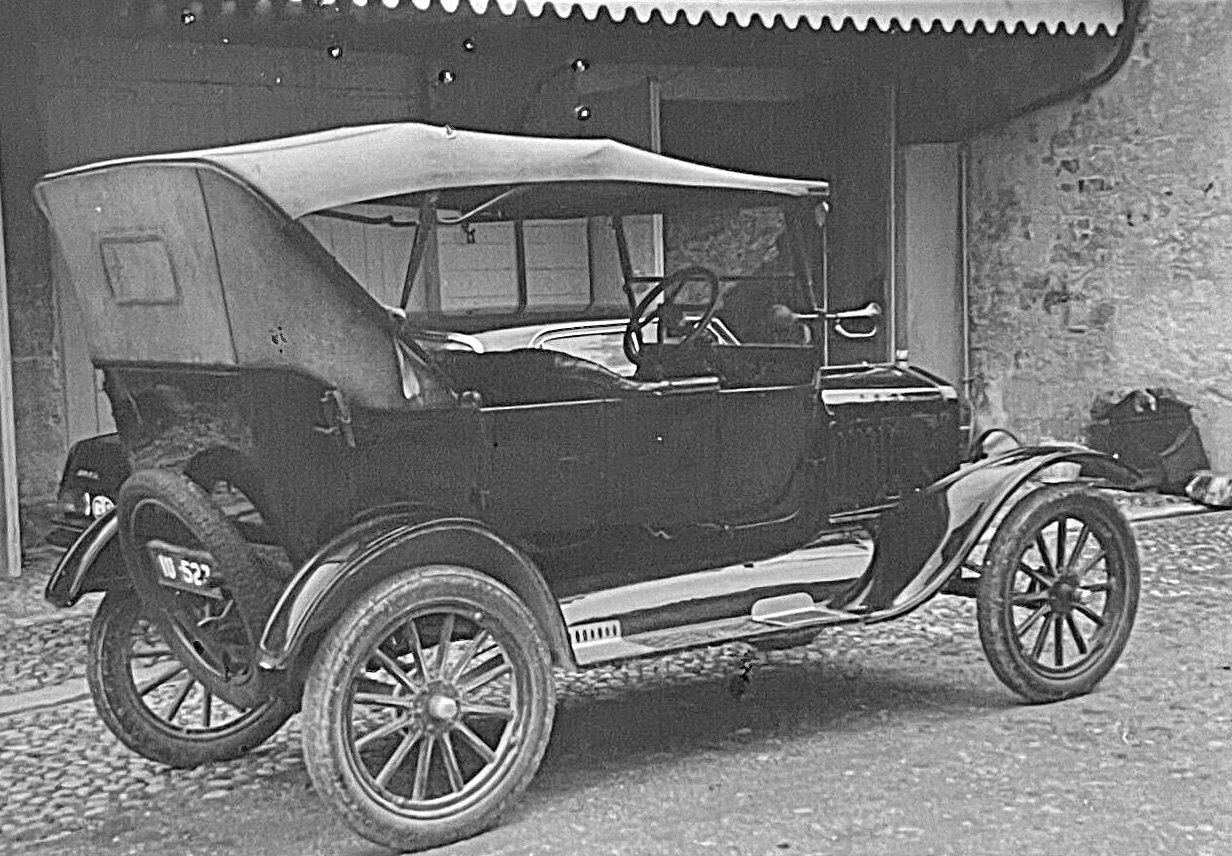 Tim J, Your family's touring car appears to be a mid to late 1917, based upon the three window "lights" on the top's rear curtain, the offset windshield hinges, and small horn button on the top side of the steering column. The top and windshield were later style beginning about mid 1917, while the horn button began for 1915 and ended very early for the 1918 model year when the combination horn and light switch was used for a bit over one year.