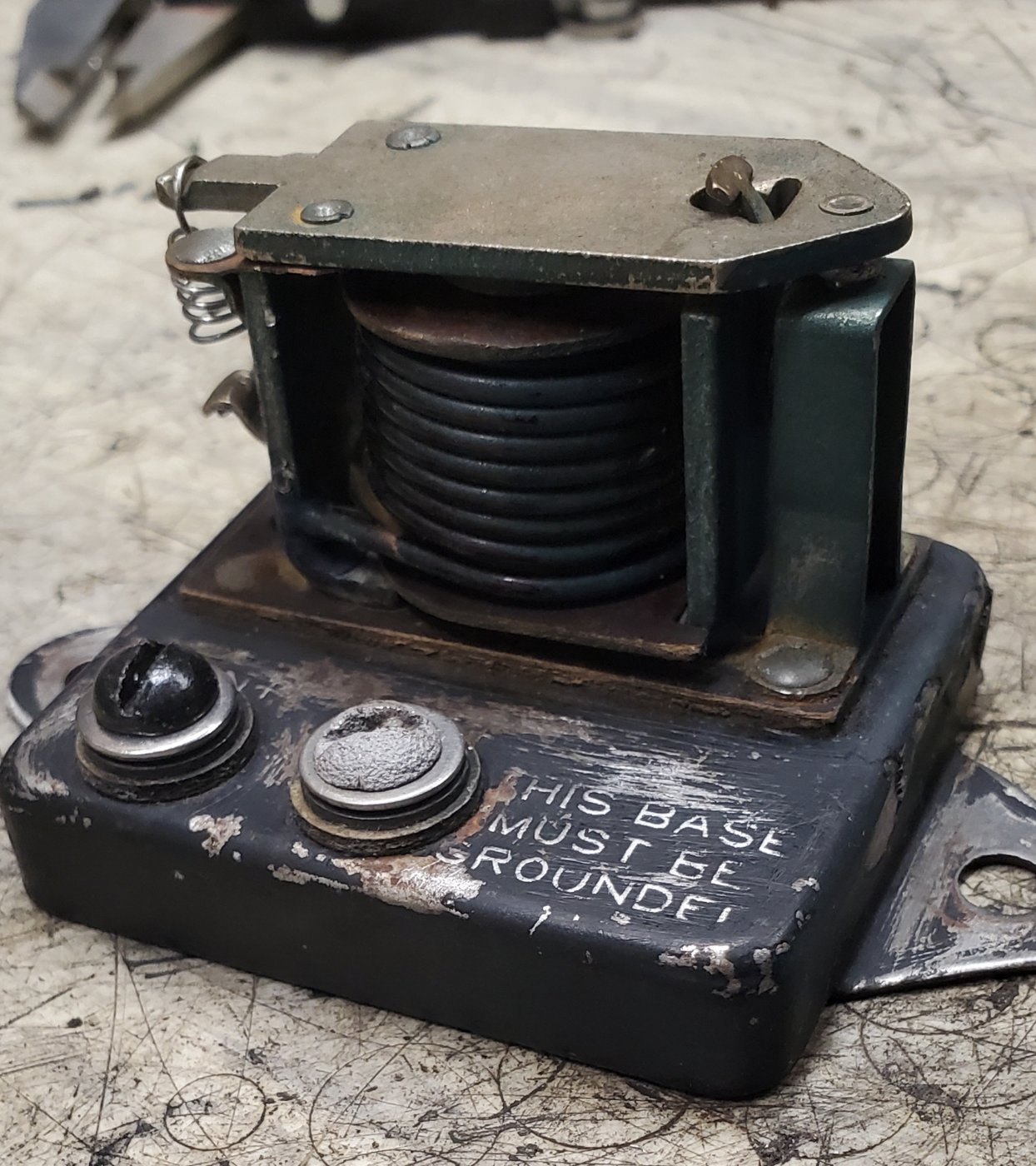It was dirty and missing some hardware on the underside, and the point tension spring was missing. Fortunately, I was able to replace the missing hardware and make a new tension spring. With this done, the points were dressed and closure voltage was adjusted to 6.5 volts. It was then painted and the original brass terminal screws polished. It now works like new.