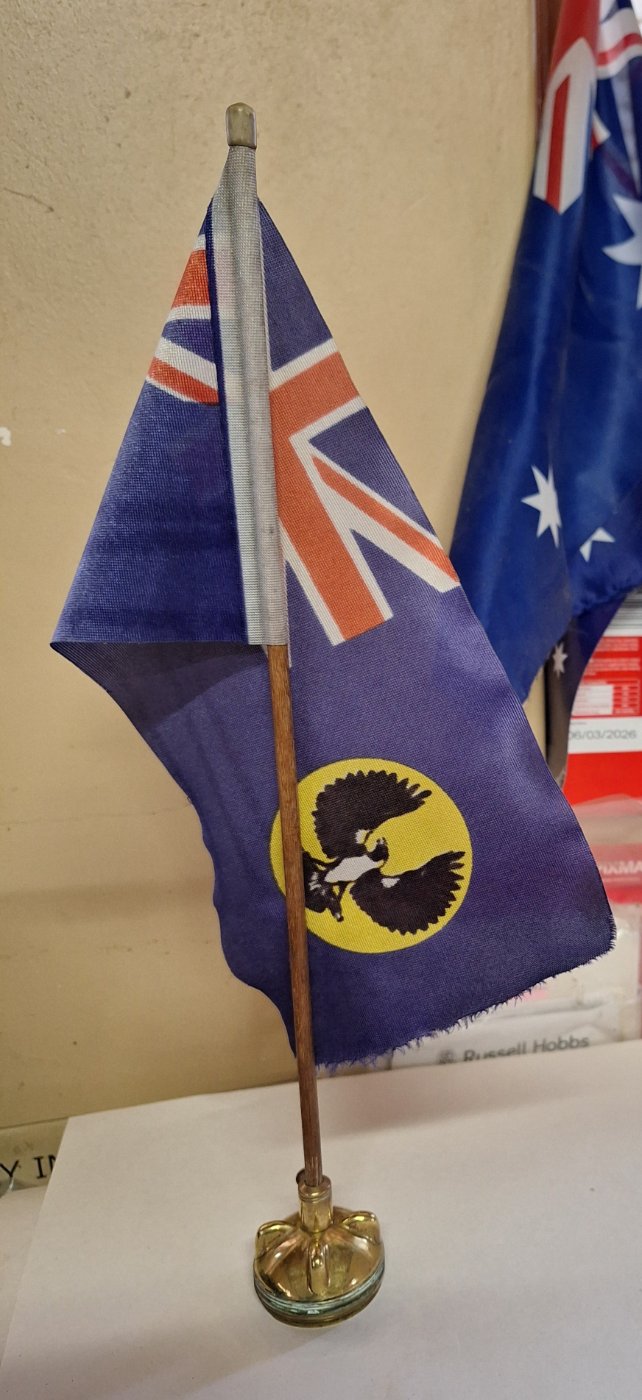 This is the Carrol and Richardson knitted polyester flag waver flag from my chocolate van. Not too shabby after 20 years. The blue is a little purplish and there is some slight fraying at the back edge, otherwise it is fine.