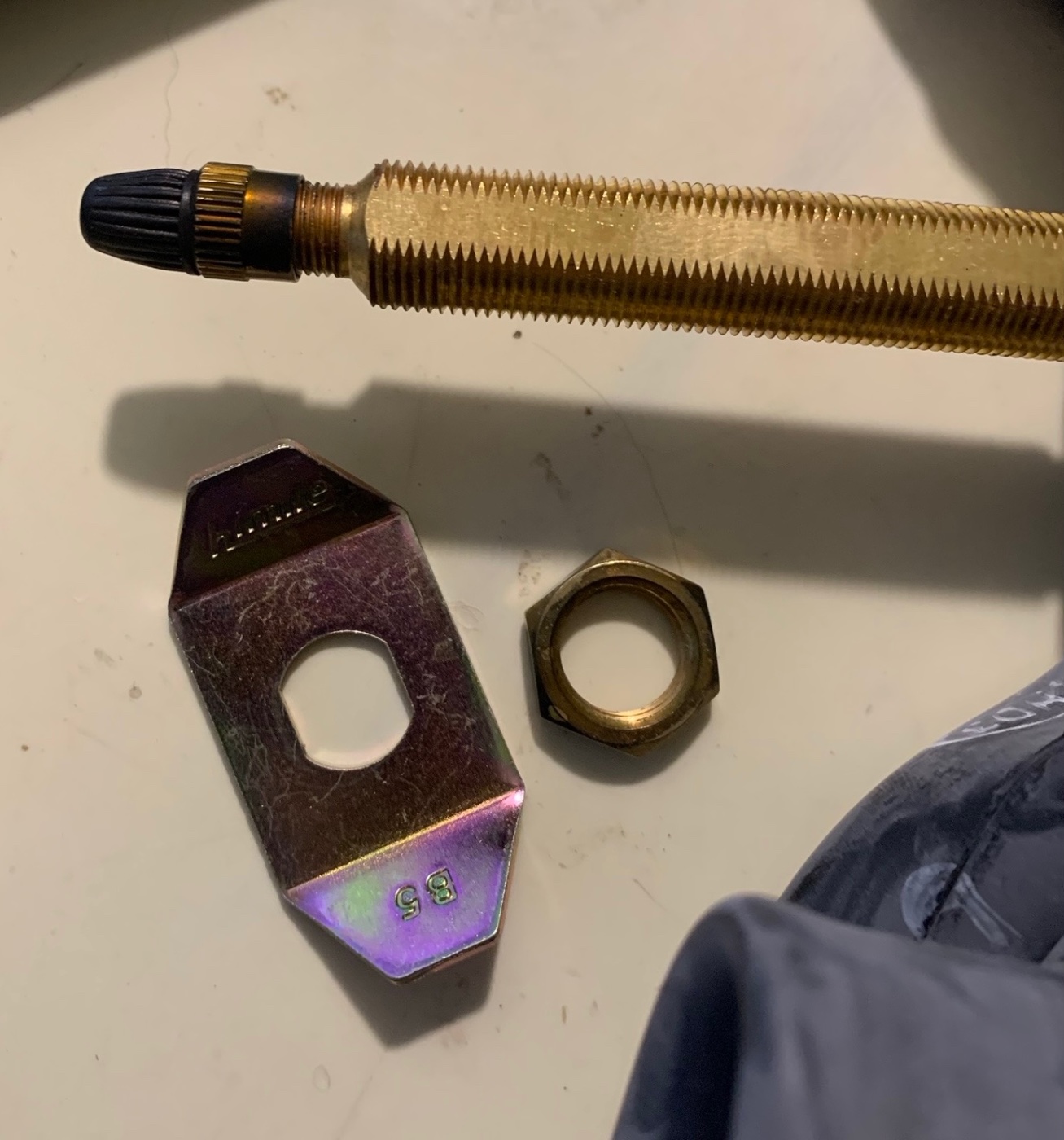 I’ve got a new Hartford 30x3 1/2 TR383 tube here in my office with me. The stem is vulcanized to the tube. The bridge washer and lock nut were included in the box when received from Coker. The stem is unmarked, the bridge washer is marked “himile” and B5. I checked the thread of the lock nut which turned out to be M12-1.25 (edit - I was wrong, see post below), which could be surprising or not, given the modern world. I believe that the other hardware from Coker, i.e. rim washers and dust covers, should be compatible with these stems.
