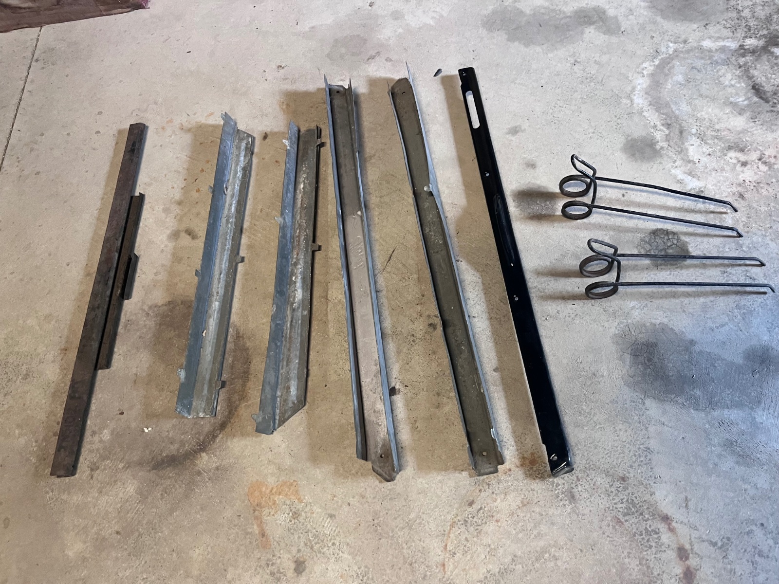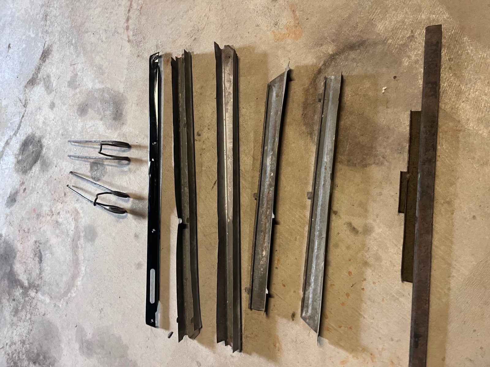 Speaking from the top and middle picture; the item on the far left is a glass channel for one of the doors. It is raised and lowered by a round part of the window regulator moving within that short channel on the bottom. The spring steel thingies on the right are aftermarket accessories meant to tighten up worn out tie rod bushings on a T whose owner won’t repair it correctly. Lastly, the item to the left of these accessories is door trim. See the slit at the upper end ? That’s where the door latch lever protrudes through when mounted.