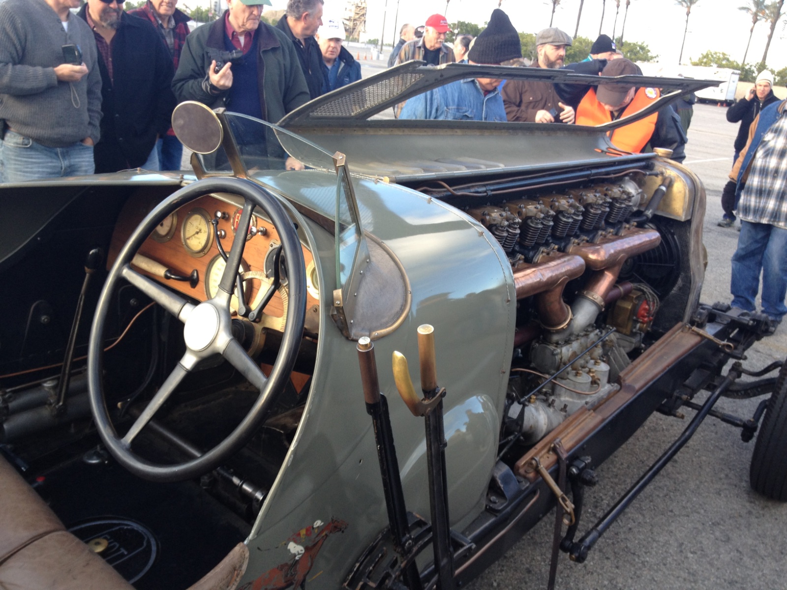 My vote is for a giant Fiat 6 cylinder engine too. Jay Leno brought a similar 1917 Fiat racer, the Botafogo Special from his collection to the SoCal HCCA Holiday Motor Excursion on Dec 30, 2012. He always brings something interesting and it always gets lots of attention.