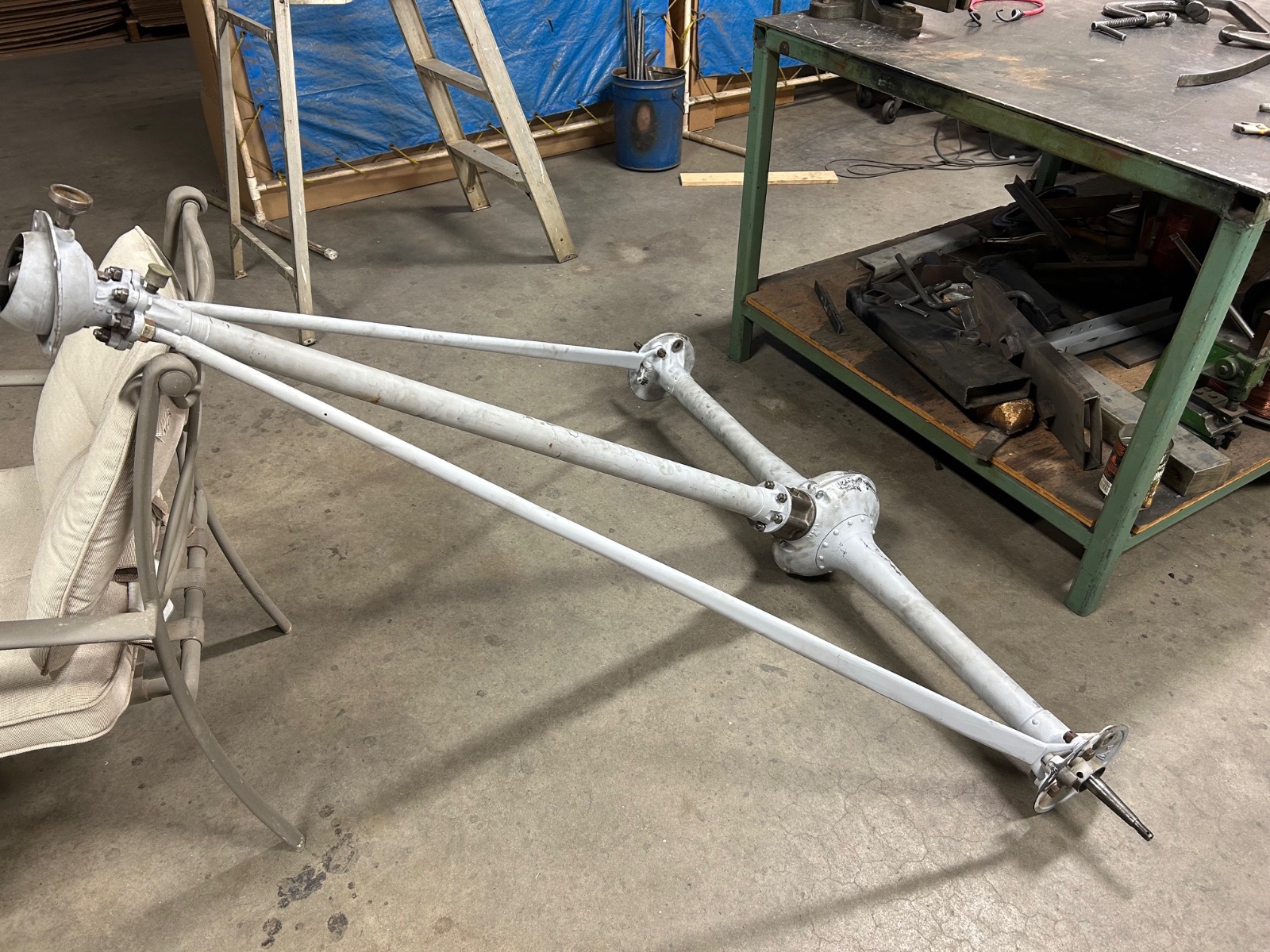 I got the bushing on the lower d/s. THE WORST JOB of this whole build. Fitting the U joint is simple. Put the axle back in the vice, split the halves, fit the pinion to the ring, removed the d/s. Siliconed the halves and bolted together leaving 4 front finger tight. Put the axle on the floor, siliconed the spool at the front and rear. Then dropped d/s over studs while guiding radius rods at top. Tighten everything up and wa-la . It is too heavy for me to lift so it will have to sit till Monday and the kids can put it back on the table.
