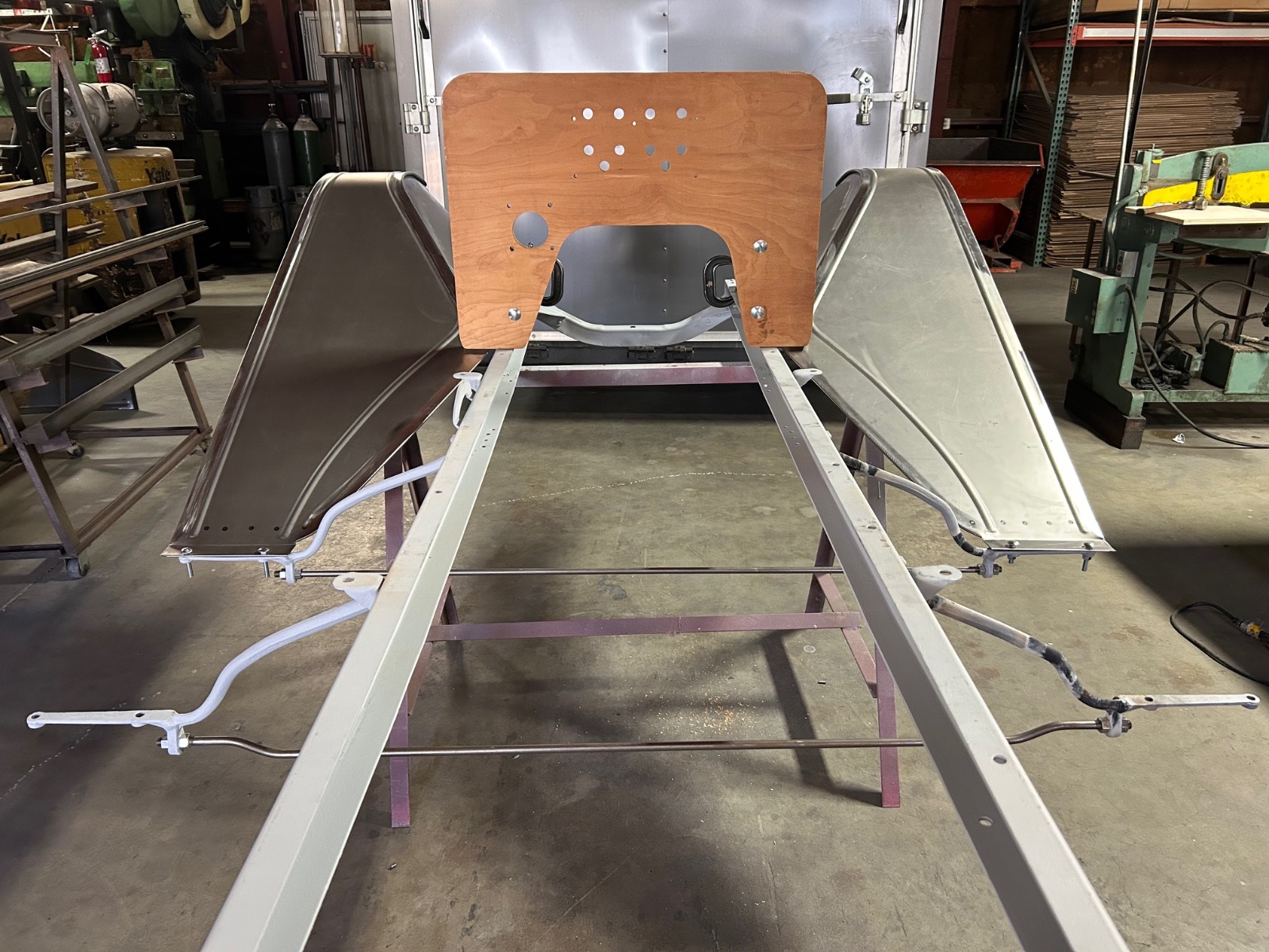 So finally starting to fit sheetmetal. Discovered the left frame rail was a 1/4” ahead of the right one, so we placed the frame catty-wampus between a 100 ton press brake and a forklift and with a few nudges we were back in square. The firewall has to be square or nothing fits.I will have to go back and check the running board brackets as well. But starting at the front, everything looks good.