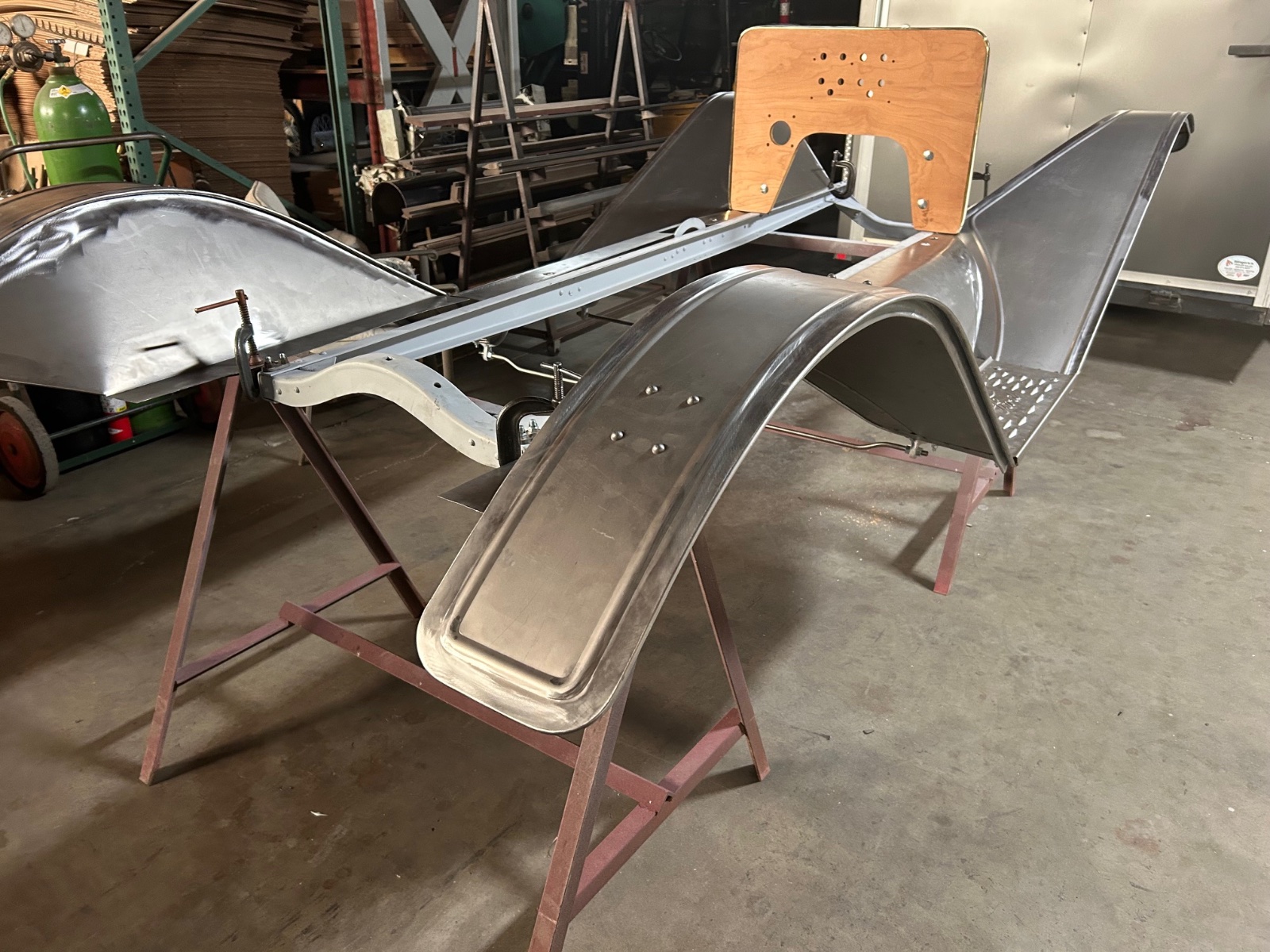 Found a Torpedo firewall in the wood shop. Looks to be a Seversons from 40 years ago. Some water stains that sanded off for the most part and a scare at the top that I think I can doctor. I used the r/b fixture to set the frame spacing ( 1/8” off ) and the pre drilled holes were very close.