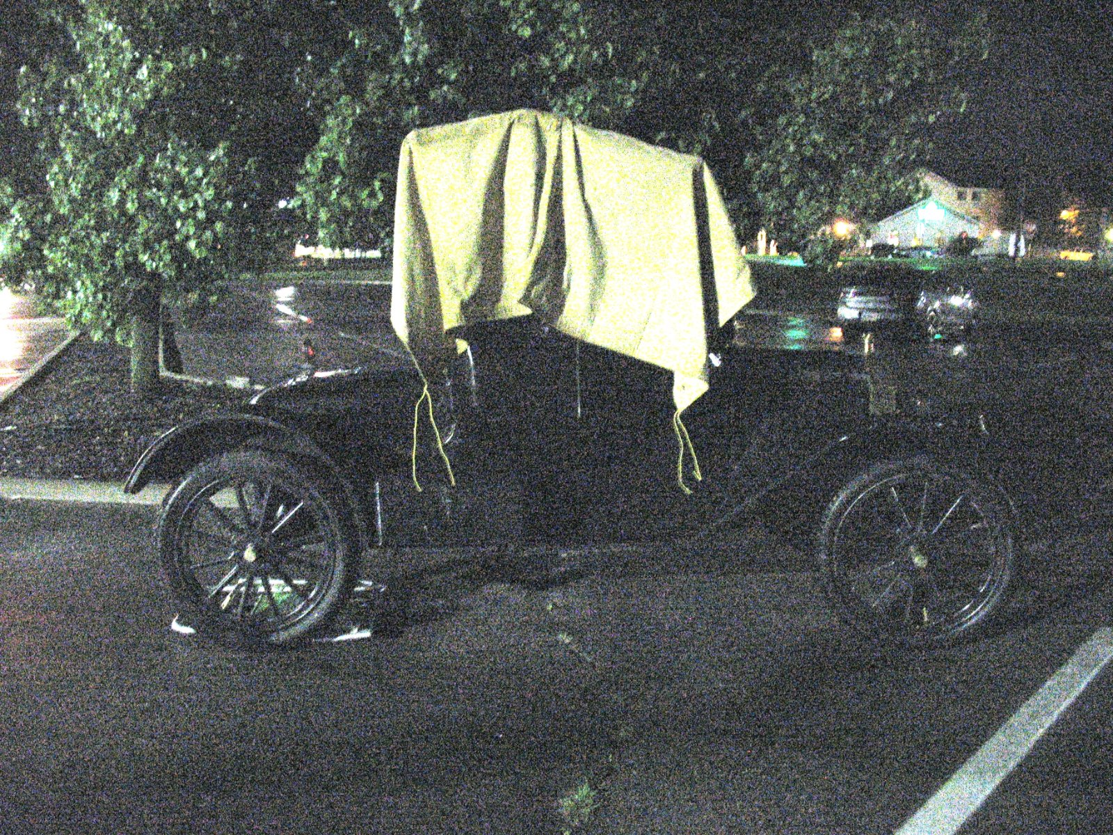 I suppose I should mention accommodations for Model T travel. In that department it's definitely different strokes for different folks. On some of my trips I've indulged in the luxury of a motel once or twice due to weather or the desire to have folks in the next county not smell me coming. But that has not been my usual style. Most nights I would find an out-of-the-way spot to bed down. In a city it was often on the remote fringe of a large parking lot. In the country or near a small town I would find a spot near the road but out of sight behind trees or tall crops. Yes, I know some folks think of sleeping on the ground as a great hardship. Nope. I've been doing it since 1946 that I remember, and maybe when I was so young that I don't. Using a sleeping bag on a foam mat on a canvas tarp has not kept me awake. In a pinch involving rain during the night I have even slept in the car. A tarp over the runabout turned it into a tent where I stayed dry. Of course, sleeping in a Model T depends on the layout of its interior, but I can tell you it didn't keep me awake.