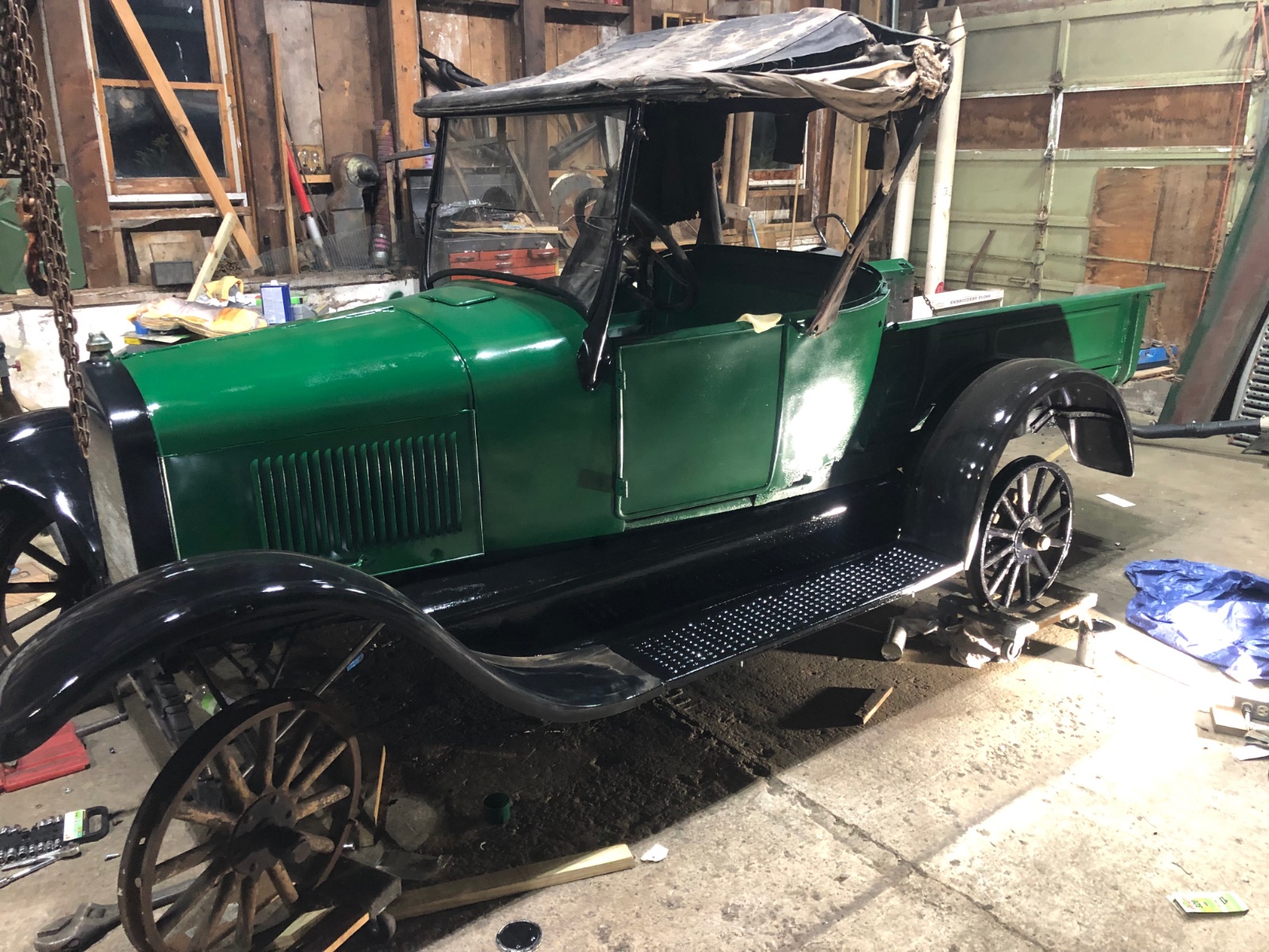 [image][/image]Finally back to work on my 26 roadster pickup, been at it a few weeks , I have a couple questions , first , is the metal cover inside the bed over the rear spring necessary or can I leave it out to make the bed floor look more streamlined ? Also , although I know it’s not correct , I have a 25 roadster top , it fits , the only difference being the location of the stanchion connections . Will the upholstery for a 26 work with these bows ?