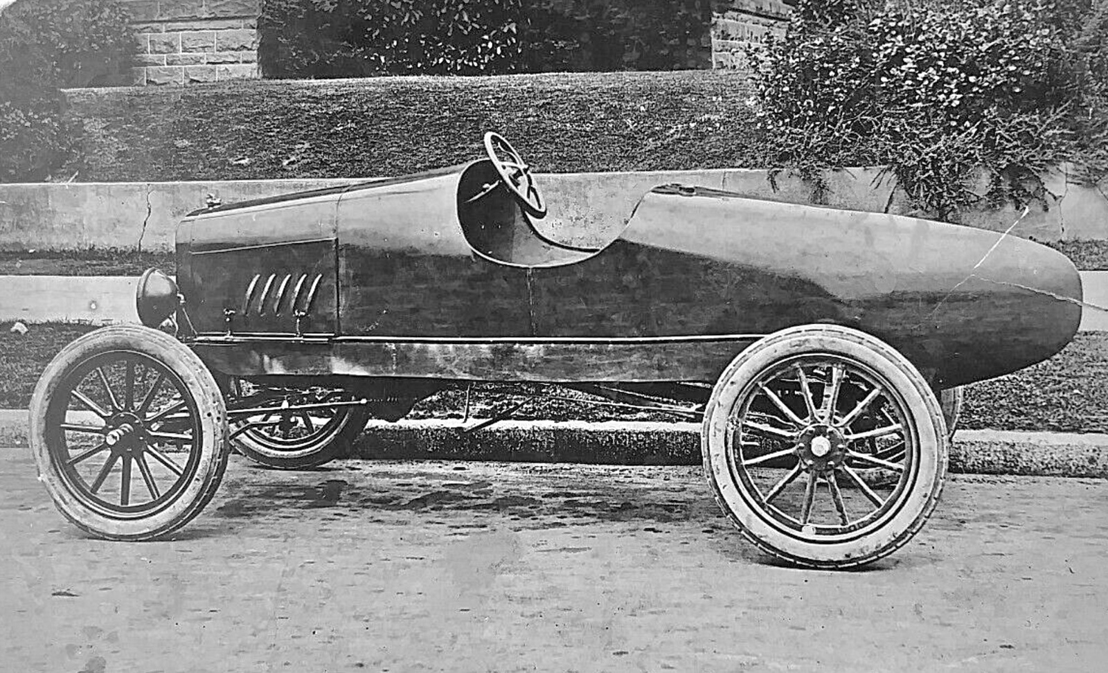 Photo #6: three men in the ‘10 or ‘11 touring— A hood with louvers ? and the most unusual front axle shock absorbers. Anybody seen these before ?