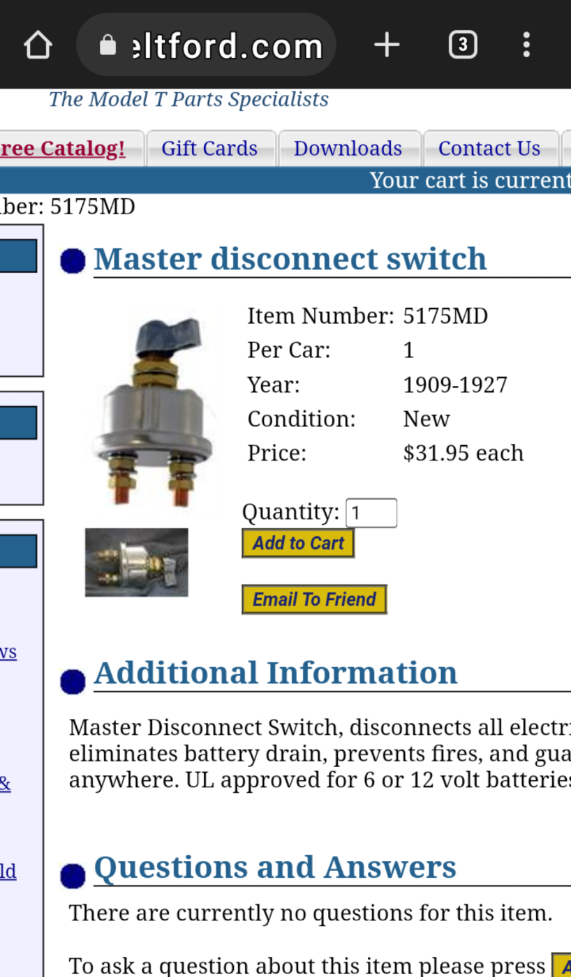 My '27 Runabout came with a battery post cutoff switch, that was probably installed in the '90s. I've had the car 5 years and the switch is still perfectly functional and is not broken or corroded. Getting to the knob through the battery access panel at the front of the trunk is fairly inconvenient, but there is nothing inherently bad in the design or construction of the switch itself. Your milage may vary.mtntee20 wrote: ↑Fri Oct 03, 2025 3:36 pmJohn, I can vouch for the Harbor Freight switches. I've used mine on 6volt systems for a couple of years now and have had NO problems with either one.