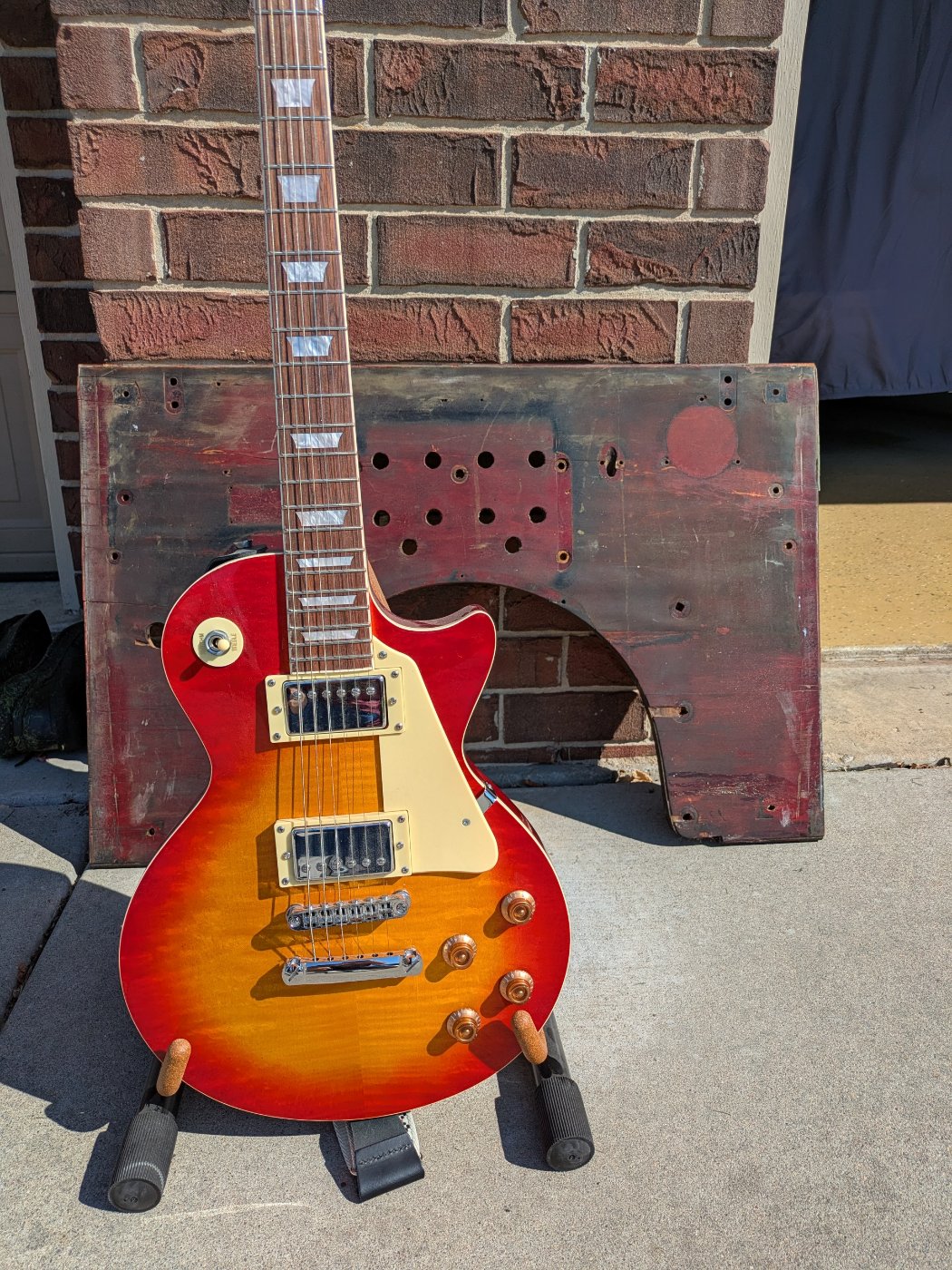 For those that have never seen what the original Ford stain looked like, here is a closeup of the area behind the coil box on the 1914 firewall that I am replacing. Also shown is the red cherry stain from the replica 1959 Les Paul guitar with the flaming cherry paint that I built two years ago. It is a transparent stain that actually matches surprisingly well!