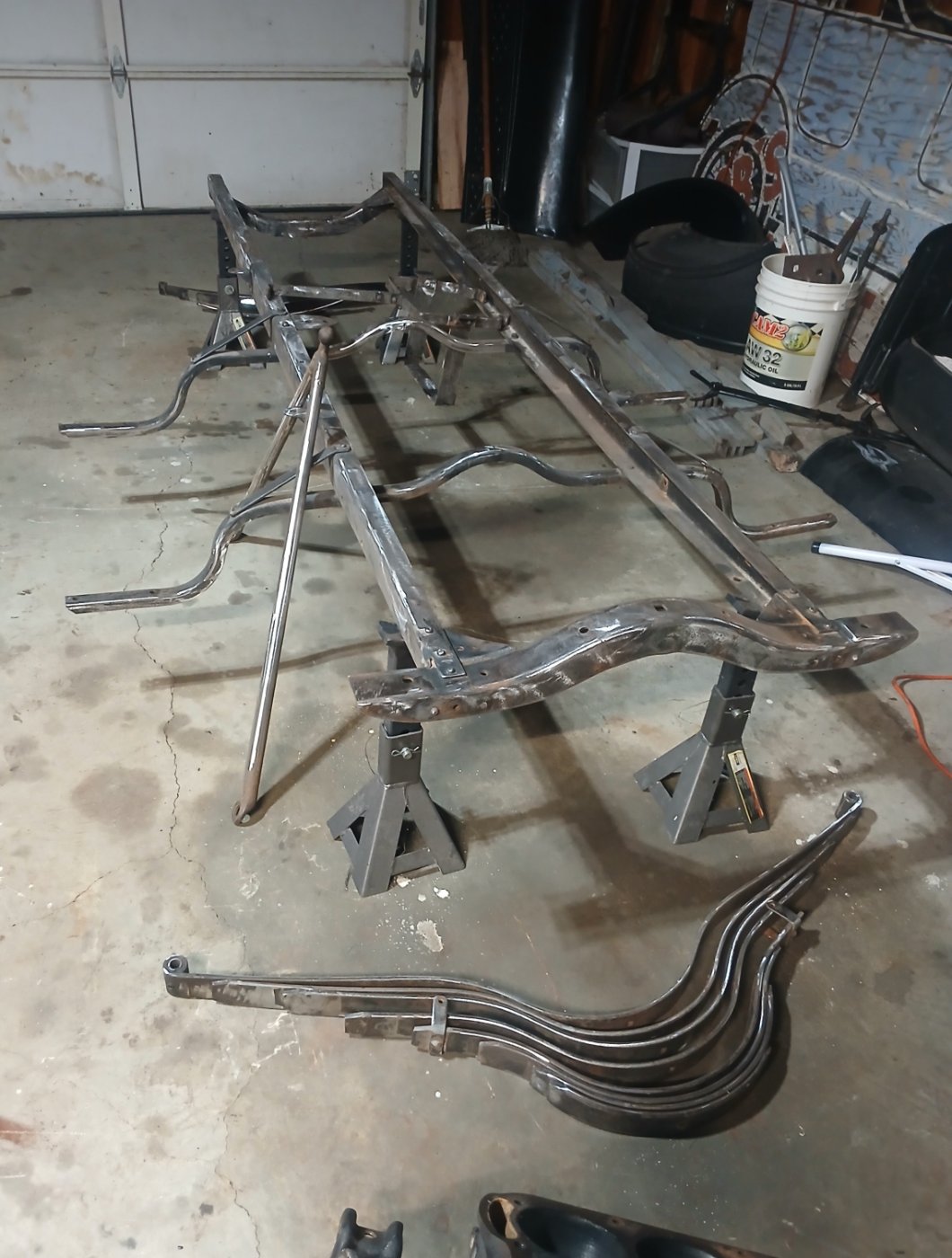 The past few weeks I've been able to make good progress on the car. I tore the car the rest of the way apart, down to the frame and clean the frame up with an angle grinder and a sanding pad. I removed both the front and rear axles and tore each apart to gauge what all parts I needed. I have began to put the rear end back together, and I'm waiting on parts for the front end. I also cleaned up all the spring leaves, surprisingly they were in nice shape, all things considered. What I found interesting was all of the Ford scripting I found on all of the leaves. Each leave had at least one Ford script, and the main rear leaf over the rear axle head not one, not two, but three scripts on one leaf!