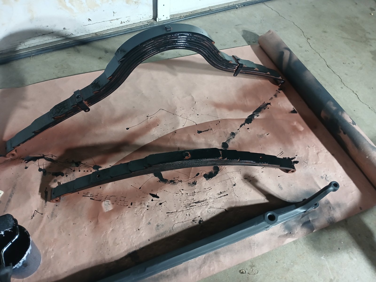 I disassembled, cleaned, and primed the leaf springs. Then I applied multiple coats of graphite spray, and assembled the two spring packs. The front spring went together pretty easy and I used all new hardware. The back spring pack gave me a little more trouble because of the contours and the fact that they are heavier duty. I ended up stacking the spring pack up until the clamps that hold the springs together, then with the rest of the leaves I turned them about 90° and was able to push the bolt through by hand without all of the leaves shifting on me and get the nut started. I tried the process of stacking all of the leaf springs and clamping them but had the issue of the leaves shifting on me and the hole for the bolt did not line up. I don't have any pictures of that process, unfortunately, because my hands were full. After the nut was started, I set the leaf spring down and pounded all of the leaves flat and tightened up the bolt. Then degreased any fingerprints and overspray from the graphite and painted with red primer, and then a coat of black rust-oleum. So far so good.