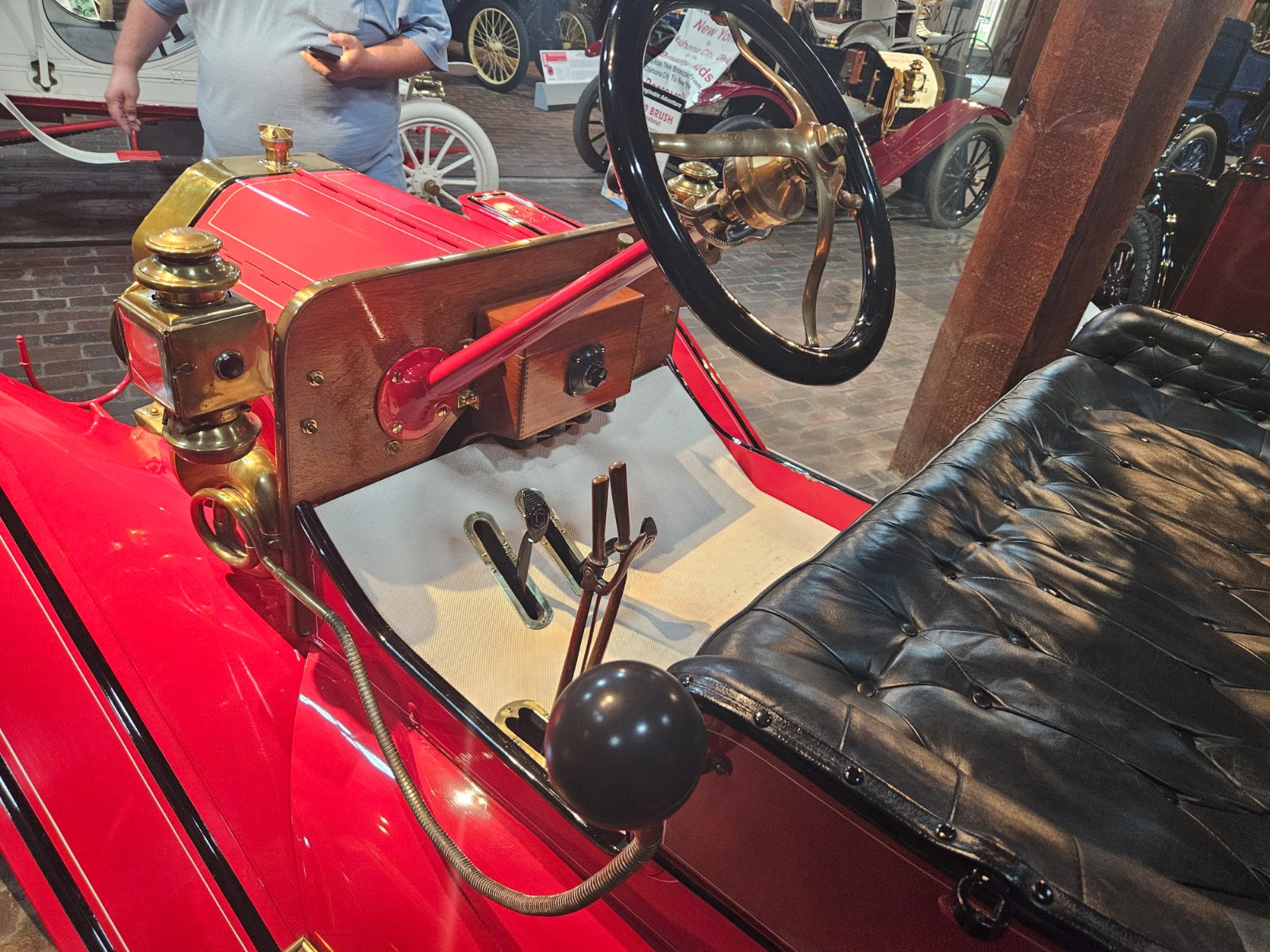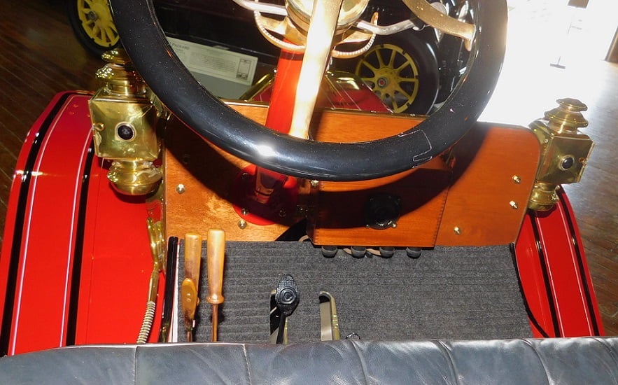 In the loft of one of the many buildings at the Gilmore is Model T Ford serial number 131. This is a two lever, water pump equipped Model T, one of the earliest known to exist today. The tires are covered by vinyl covers intended to reduce the graying effect of sunlight on the tires. Note the linoleum covered wooden running boards with brass edge trim, a feature discontinued after the first 2499 Model T’s. The rear body brackets on the first 2499 Model T’s had four bolts as seen here and the fragile “no rivet” 1909 rear axle assembly as used on the first 10,000 cars. Notice there is not a pinion bearing housing, the driveshaft was supported at each end by a babbitt bushing. The car was purchased with no options, and remains that way today. As such it does not have headlamps, a windshield, or a top. Controls in the first 700 Model T’s consisted of two pedals, two levers, the mixture control, steering wheel, spark and gas levers.
