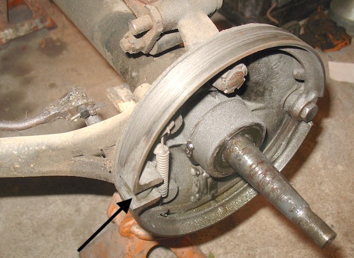 When I fit the new lined one piece brake shoes I put a hacksaw cut half way through the casting at the pivot point hole. This provides a weak point which will cause the shoes to break there, but the return springs will hold them in place for continued use if they do break. Be sure to fit the return springs with the open end outwards so they will tend to keep the shoes against the backing plate.