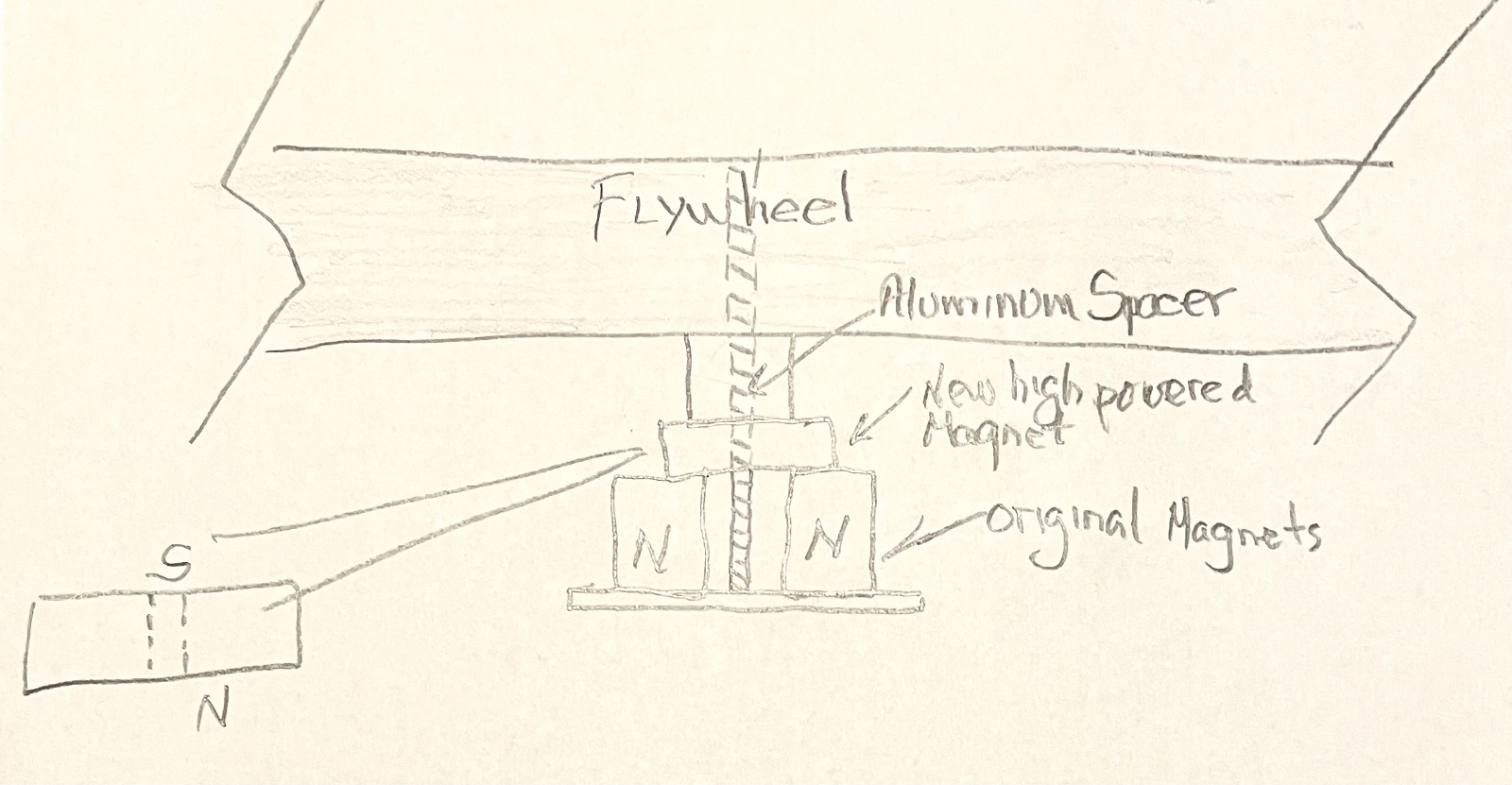 Still playing with various size magnets and gaps. Not sure what the optimal output would be. Flywheel weight reduction would be in the seven to nine pound range. Your mileage may vary!