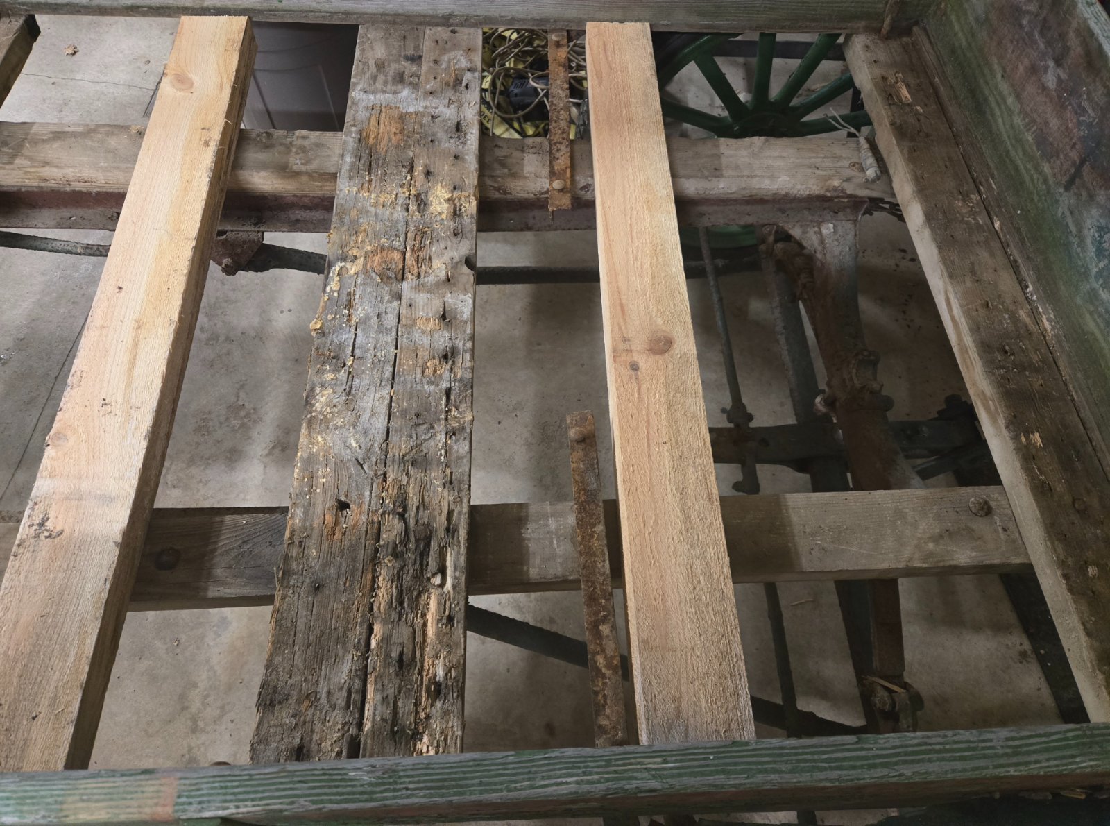 Just finished putting a new floor on the wagon. Unfortunately, it sat outside for sale for months and started growing mushrooms underneath. It's a shame that it lasted for decades under a roof just to rot in a yard. The rot on the ship lap floor was significant. I decided to try to preserve what I could and then structurally rebuild around the original bad wood. Then put flashing over the cross members. Since I will use it to collect maple sap, I left wide gaps for splashes to drain through.