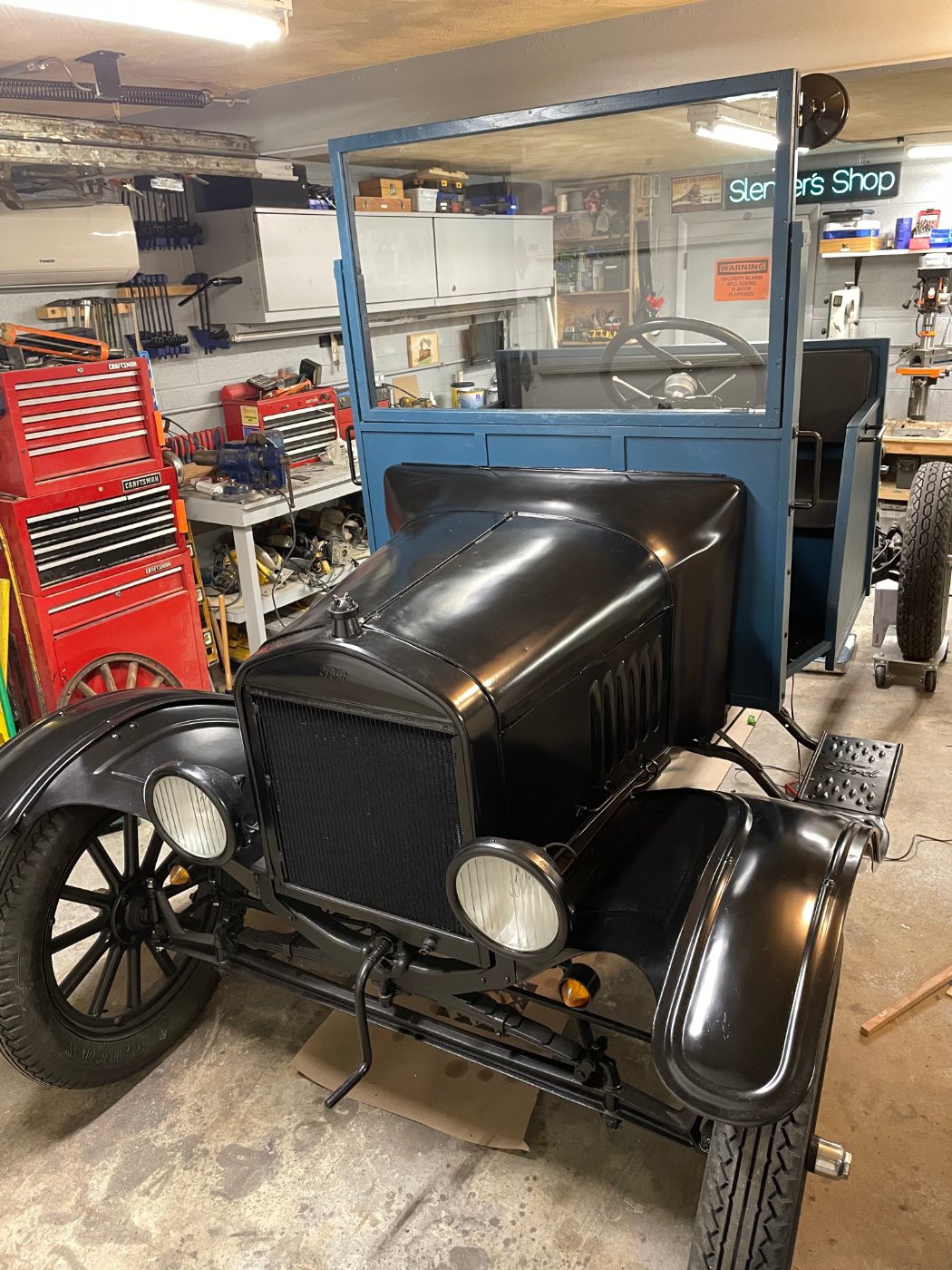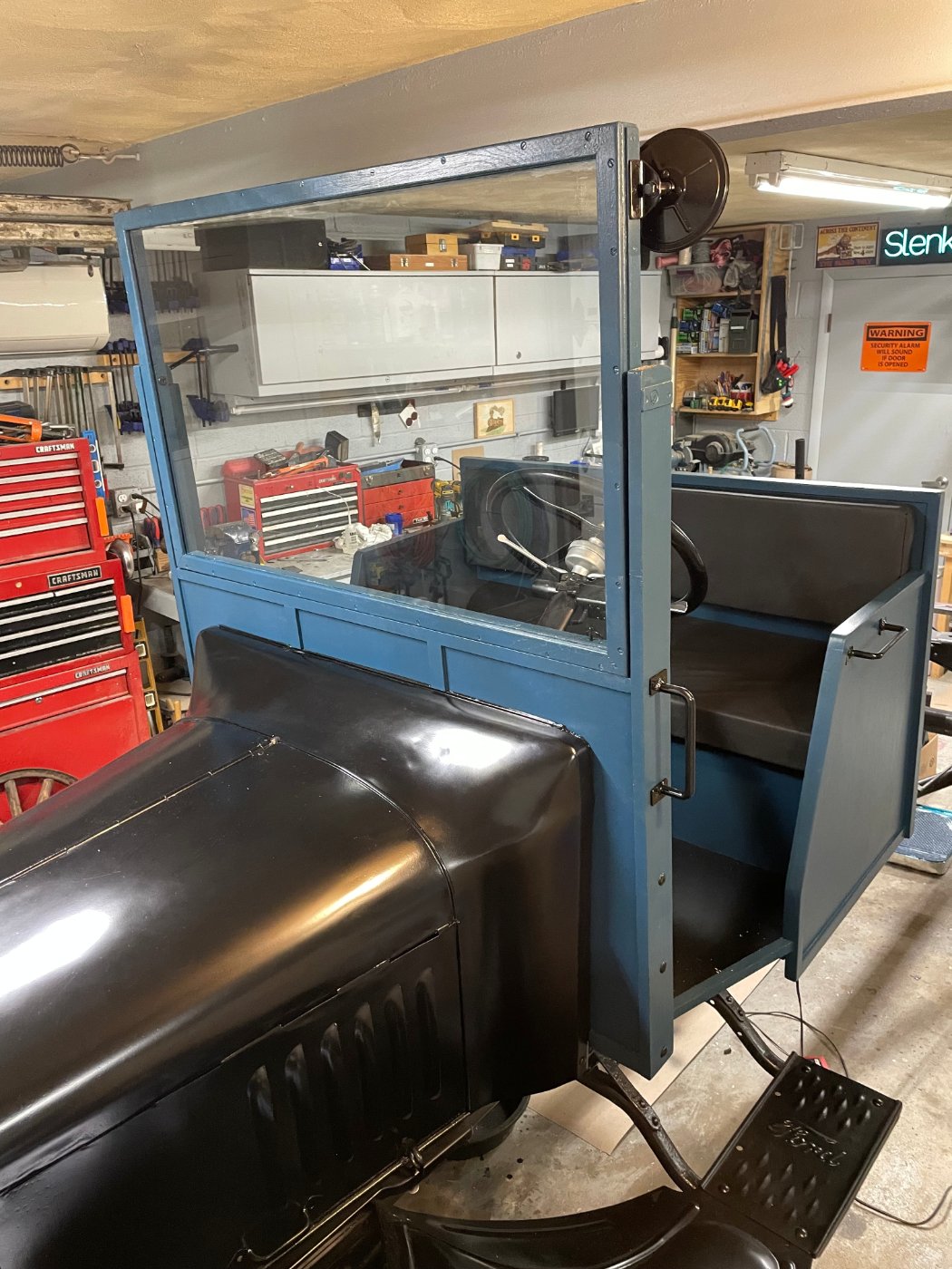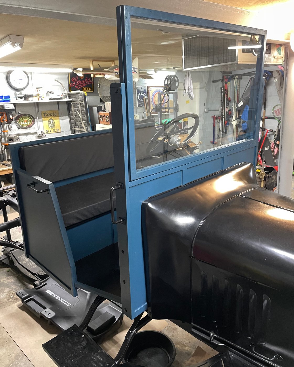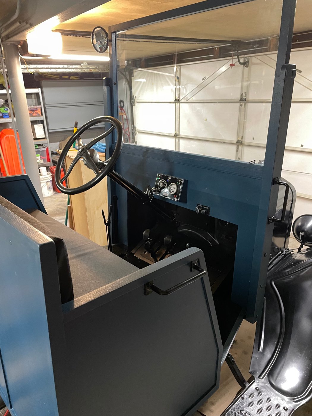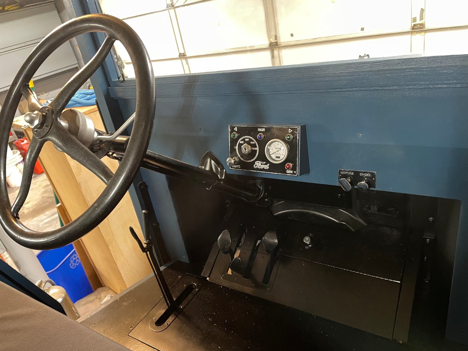 Mike, the gauge is a speedometer. I decided to nix the amp meter and put a small speedo in instead. Obviously it's not a standard cluster but I feel it has the original vibe still. The height issue is a good catch, you are very observant. The original cab is indeed from Parry in York PA just down the road from where the truck was living. I would love to put the original back on at some point if I build a larger shop down the road. For now it would not fit in my low garage. I'm also possibly too tall a person to fit in a stock Parry cab. (6'4") The low garage necessitated a few adjustments to my original plan. One, no enclosed cab would be possible. Two, the windshield would need to tilt to get in and out. There are pins that lock the windshield in the down position that need to be pulled to pivot the windshield up for entry and exit into the garage. The pivot point is off center so gravity and wind load will always pull it down into it's driving position.