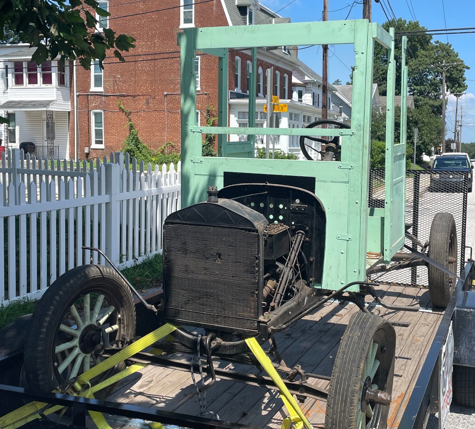 Your tie down method when bring it home is different. When a T or TT is complete, you do not have that option. Going around the frame and the axle puts load on the front spring. It is better to go around just the axle, outboard of the spring perches. That way the vehicle is free to dance on its suspension as if it was on the road.
