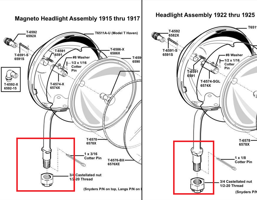 A true 1915 has the bulb base has contacts at different position, vertical in stead of horizontal & the end that fits into the fender bracket is different as well. The drawing for the 1922-25 headlight has the wire socket orientated incorrectly, contacts should be horizontal