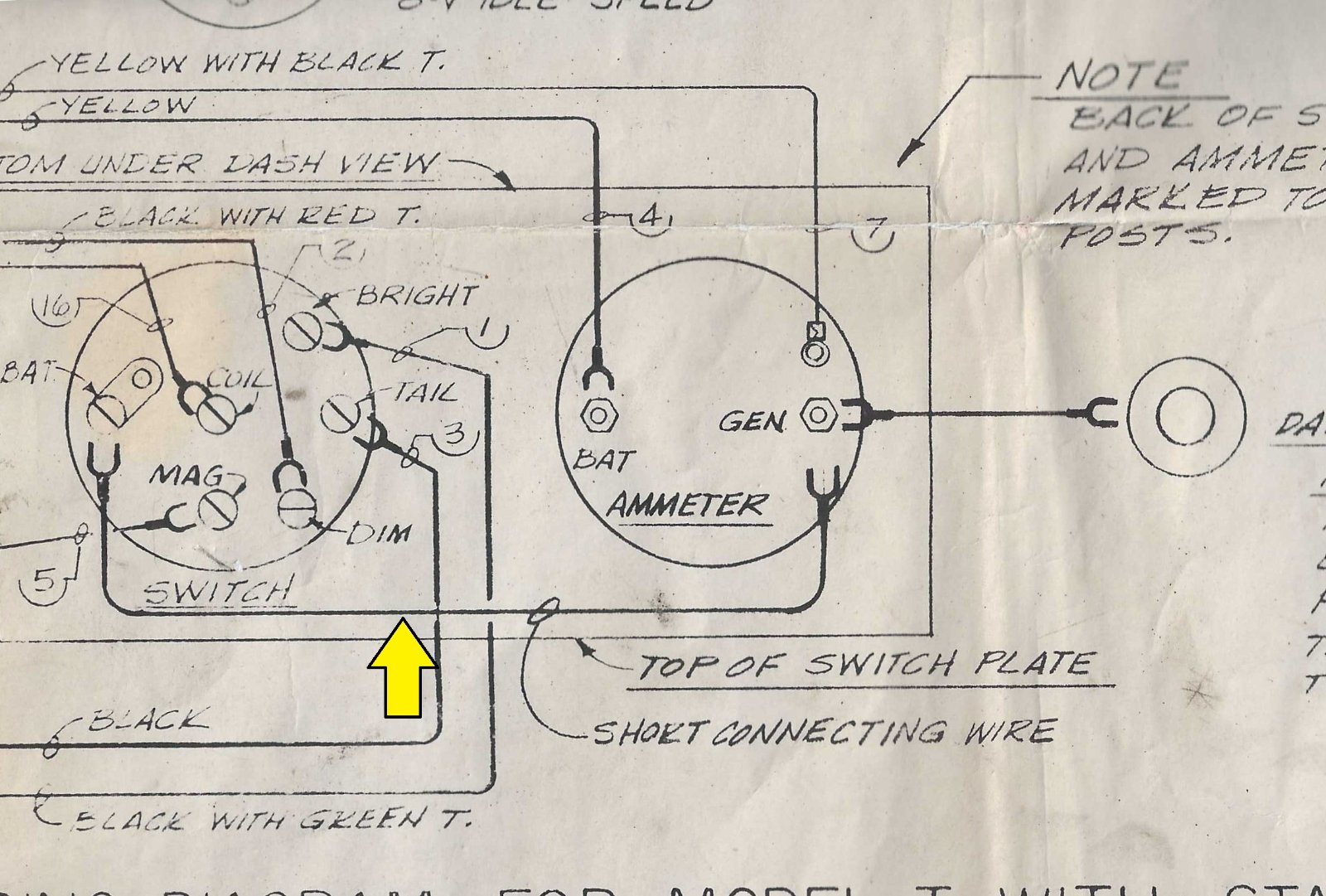 Looking for other possible causes of the charge not reaching the ammeter, I studied the HUGE wiring diagram by Patsy Winn, tracing from the generator to the firewall terminal block and hence to the ammeter. When I swapped wires around on the ammeter to get the correct orientation, I noticed that the short wire on the diagram running from "Batt." on the switch to the "+" side ammeter terminal is missing (see yellow arrow on attachment). Granted, the diagram is for a 1919 to 1925 Model T with starter, but unless this wire was dropped in 1926, shouldn't it be there, connecting the switch to the ammeter? That would make TWO wires on the positive ammeter post, not counting the dash light, which is also missing from this car. I am wondering if perhaps the lack of this wire might explain why the charge from the generator isn't making it to the ammeter. Yet, in the wiring diagram in MTFCA's Electrical Booklet, this short wire is present, but the longer wire from the "Batt." terminal strip does NOT run up to the ammeter, meaning the "+" ammeter terminal has only ONE wire connected to it. Which is correct for my friend's 1926 T and could the missing short connecting wire be why the generator's juice doesn't reach the ammeter? Grasping for straws here...