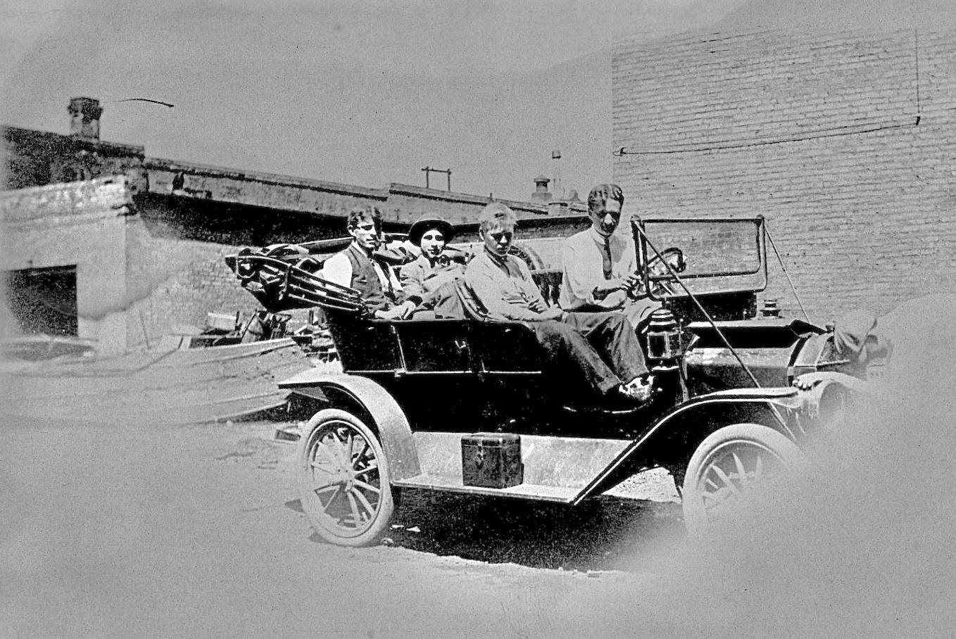 The wheels and rims are painted black. However, if you zoom in close, you should be able to see several of the silver lug nuts on the front and rear wheel. They appear to be four lug rims, not the five lug like nearly all the brass era after-market demountable rim wheels. Hence the wheels appear to be the typical 1920s Ford factory demountable rim wheels.