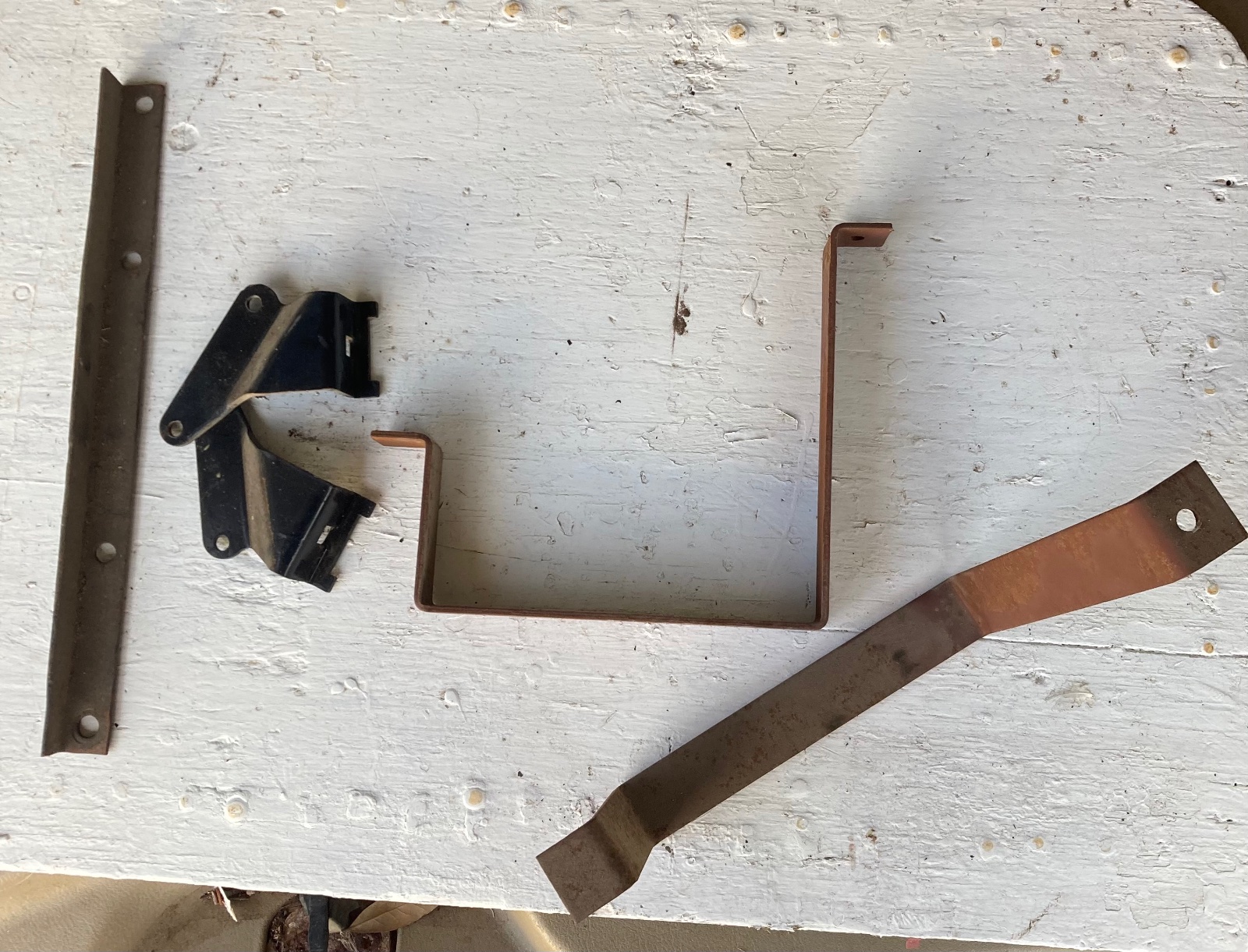You need 5 pieces - all of which I think Snyders or Langs sell. One photo shows how they all fit together. There’s one angle iron with 4 holes. Outboard 2 bolt into the runningboard supports. Inboard 2 bolt to the 2 strap metal pieces. Other end of the strap metal pieces bolt to existing holes in the runningboard. Then you’ll fashion a wood base to fit in this strap metal cradle into which you’ll place your battery. Finally, theres 2 hard to find brackets that bolt into 2 holes (5/16”) pre drilled in the runningboard supports. I only picture one. If you can’t find these from the vendors, call Paul Ray Martin outside of Slaton……