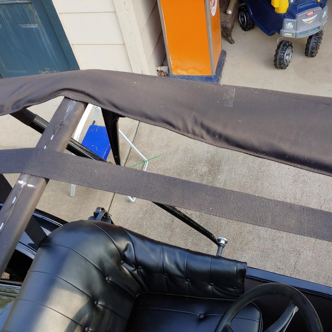 Ford put a strap inside the pads, and tacked them to the bows. You really don't need to tack the center strap to the middle bow, but it will help keep it aligned. You need to have the rear bow lean out from the back panel at least an inch. You can use a plumb bob for that, or even a bolt with a hole through it. It appears you don't have enough padding in you pads. You will also need to cut a slit in the front of the top on the right and left sides to get it to look right, and then run your hidem welt over that.