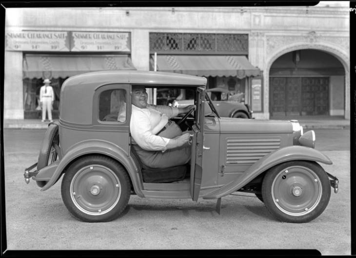 Captioned "Harry Moore, 500 lbs. man, in car."
