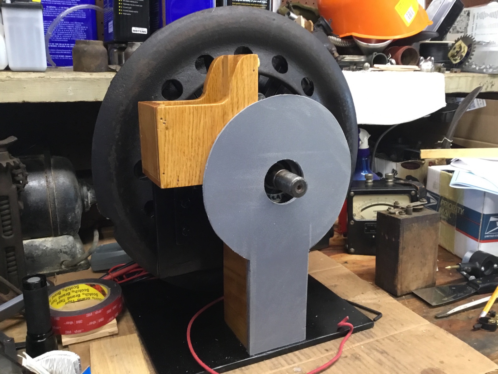 Starting to get an idea of what this is going to look like. Today I mounted the big parts, flywheel and field coil, and am still working on alignment. As a side note, if you’ve never lifted one, these things are heavy, so final assembly will happen on it’s work stand. I’m not sure where the meters will end up, but the photo shows one possible location. None of the wooden parts are permanently installed yet.