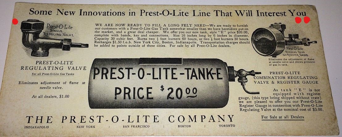 Most early Prestolite tanks did not have the name pressed into the tank shell. They had a '10s era version of a decal (silkscreen) on them which usually has disappeared decades ago. They came in several sizes and were used on many if not most makes of cars in the years between 1906 and the emergence of practical electric headlights.