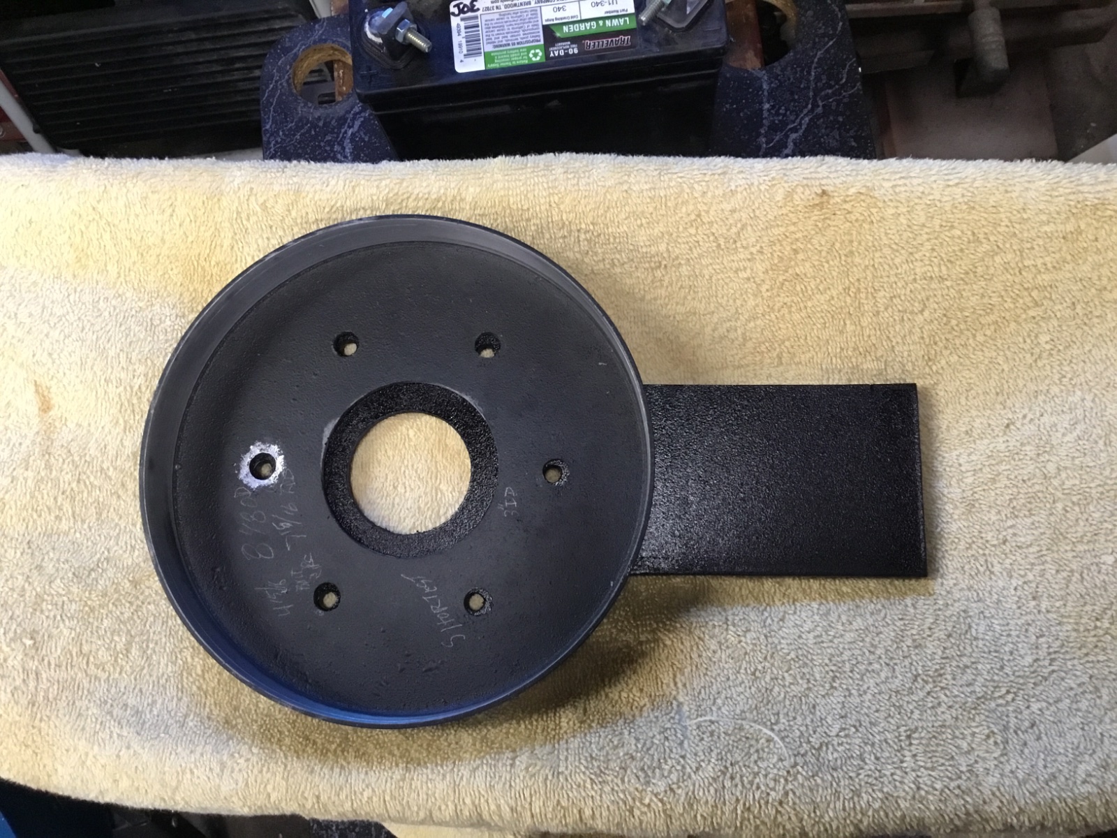 Here is the drilled and painted back-panel for the brake drum. I’m using transmission cover screws to attach the drum to the panel. They fit perfectly, although one screw will have to be longer to attach wiring to the back of the drum. The larger holes in the drum give you some wiggle-room to center it up around the “crankshaft”. Waiting for screws, wire ends, etc, to come in the mail today or tomorrow. Almost done.