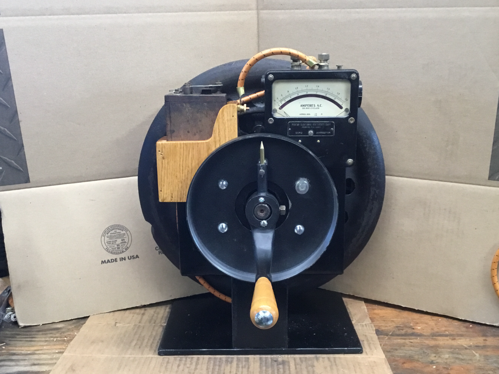 The remaining parts came in the mail, so the insulator board and brake drum are installed. Here are a couple of photos, one with and one without the crank. The shiny hole in the drum is where the wiring will be connected at the back. All that’s left to do is to hook up the wiring and mount the meter. (Pardon my messy work bench.)