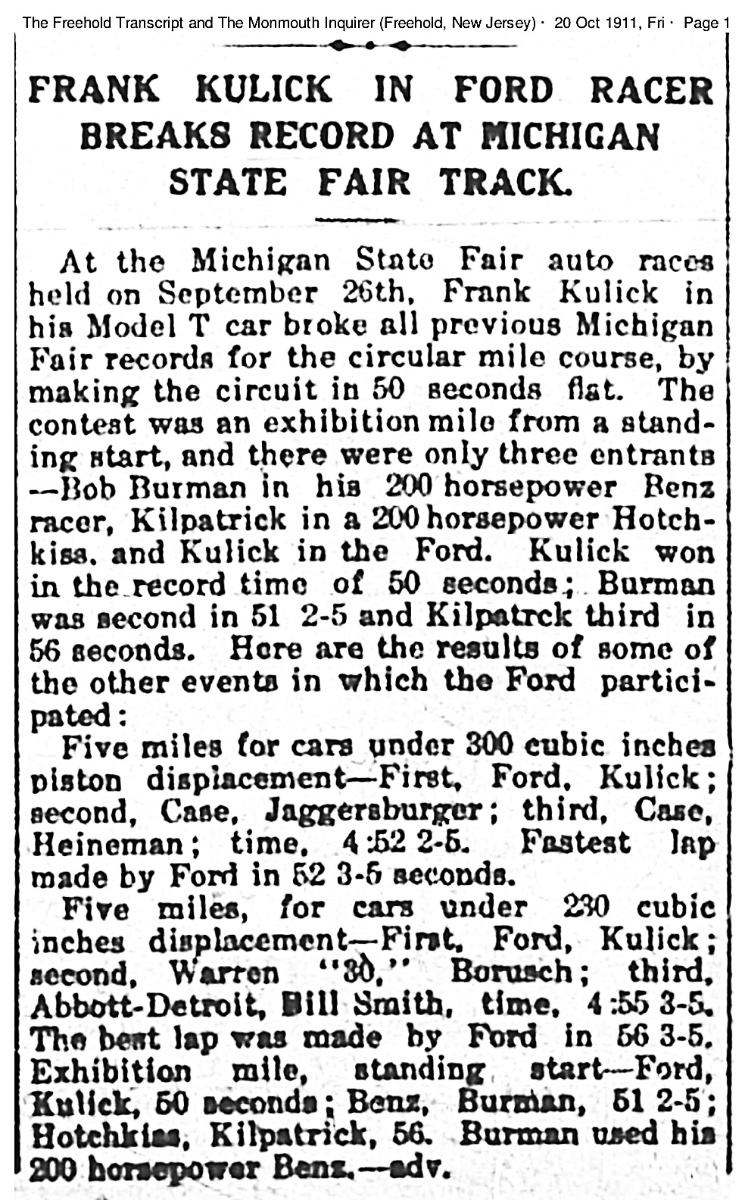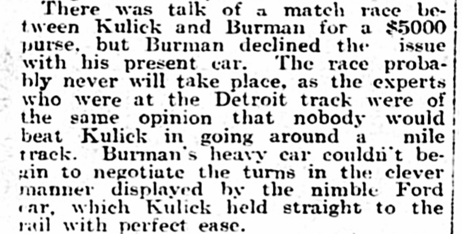 This also provided Joe Galamb and Henry Ford the chance to demonstrate to the world the abilities of their smaller racers, the 300 cubic inch and 230 cubic inch Ford Specials, that also won five mile races that afternoon, all driven by Frank Kulick: