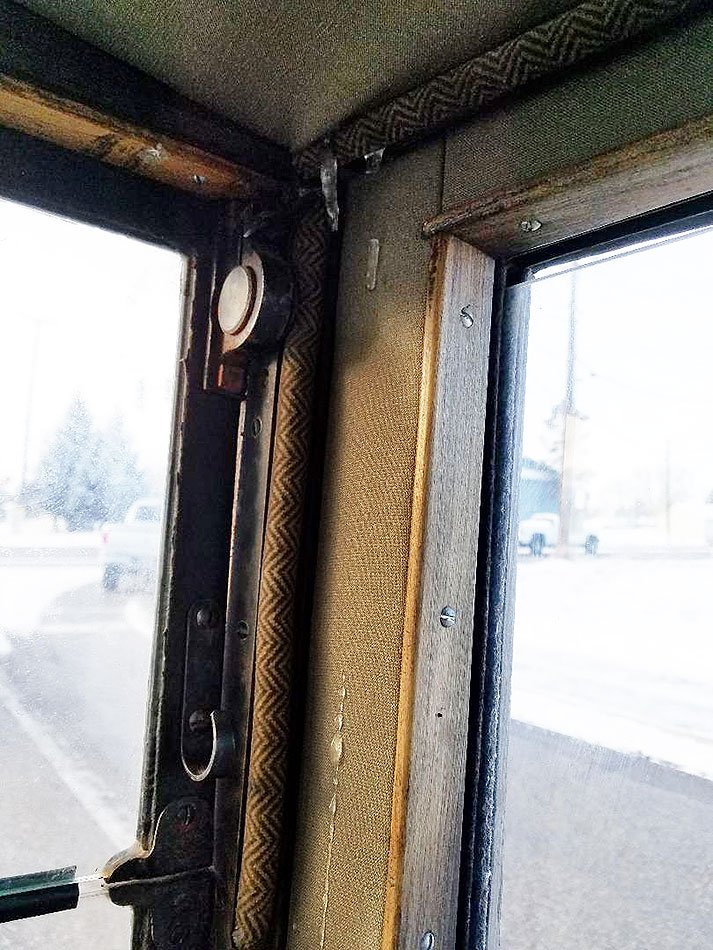 Today I learned that if one door freezes closed and can't be kicked open from the inside, driving over uneven ground will jar it enough to be opened. That of course assumes you got in the second door. Ice formation is due to the rain rail separating from the roof. My choice of pine for the wood structure allows the nails to work loose more easily. The result is a hole you can fill with epoxy (when warmer weather comes) and press the rail rail back in place. This results in a fix almost as good as using hardwood.