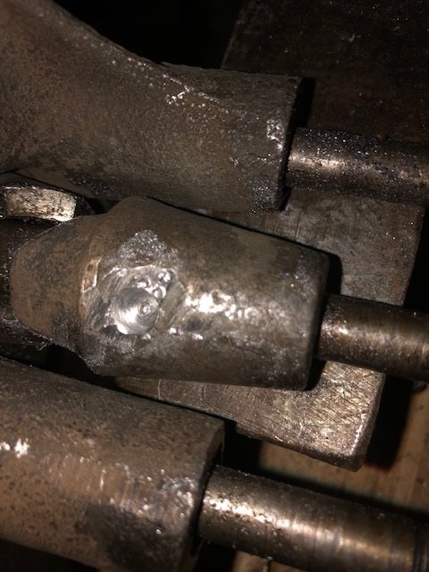 Low pedal cut off, note surface ground to be able to locate the center of the old rivet.