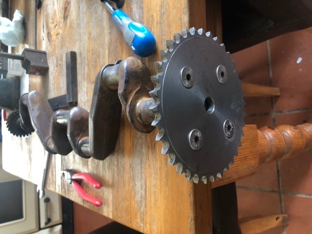 Yesterday i had a short spell on the job, i finished tapping the cross pin to mount the sprocket on the nose of the rear motors crank, it will get a key cut in when i strip the motor to wash it all down (as it is backed with grease for storage) that let me bind the twio motors together for the first time.. i hope to get hold of one of Les’s floating trans shafts to help the long drive train balance issues