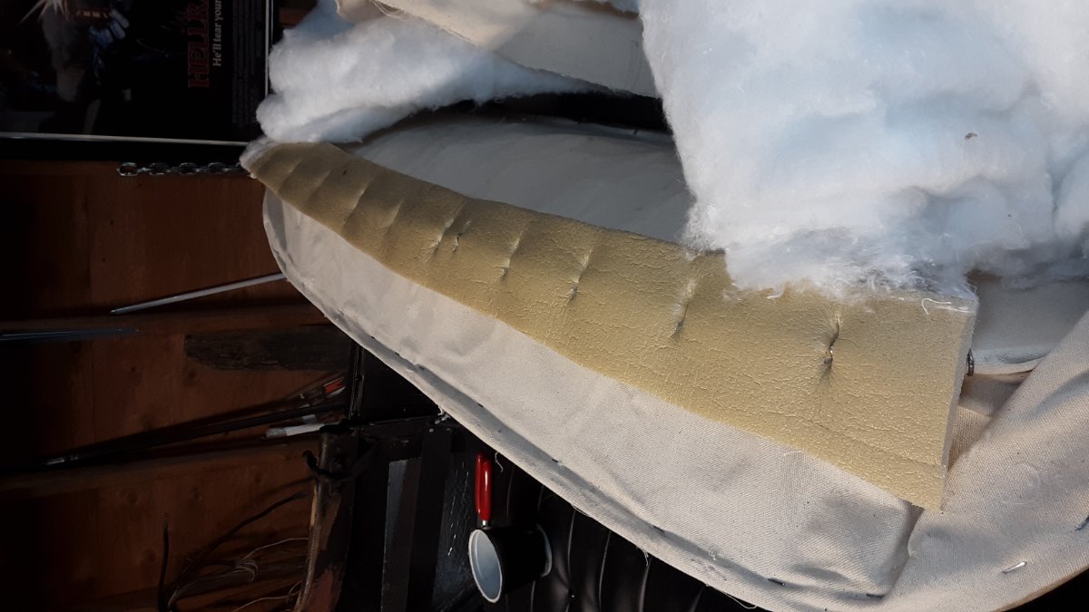 Made some headway with the seat upholstery today. Had a few things to fix once I got in there. Installed the new back springs, covered them with canvas and cotton wadding and started to tack the cover material along the bottom tack strip. Seems impossible to get my pneumatic tacking gun in there. Guess I need to use the old spring type.